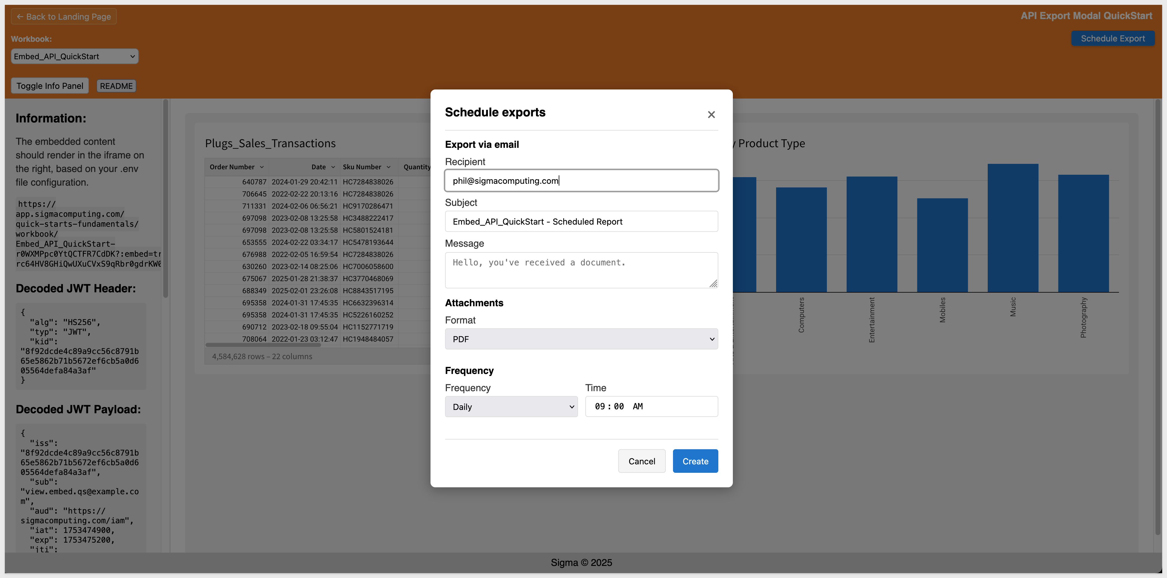 Send a workbook, workbook pages, and individual workbook elements as supported attachment types, such as PDF, Excel, or PNG files.