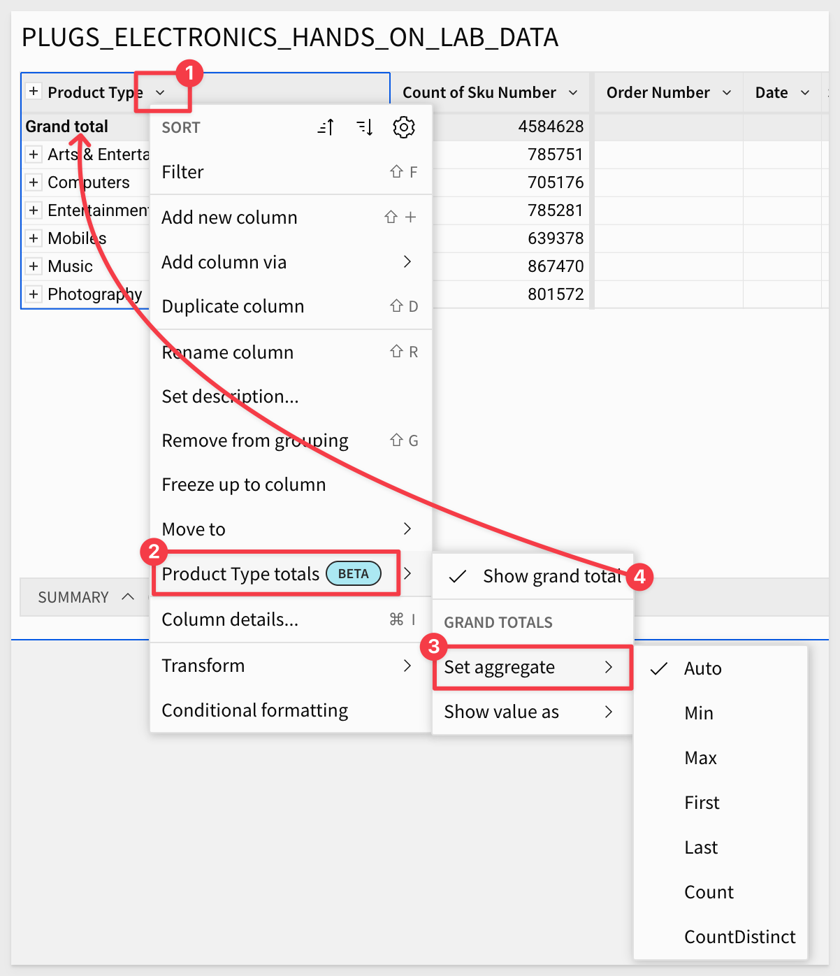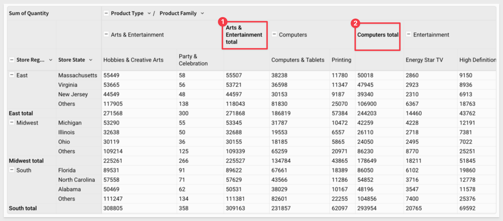 Simply right-click a table cell to open the context menu and select Show all totals or Hide all totals to show or hide totals for all grouping levels of the table.