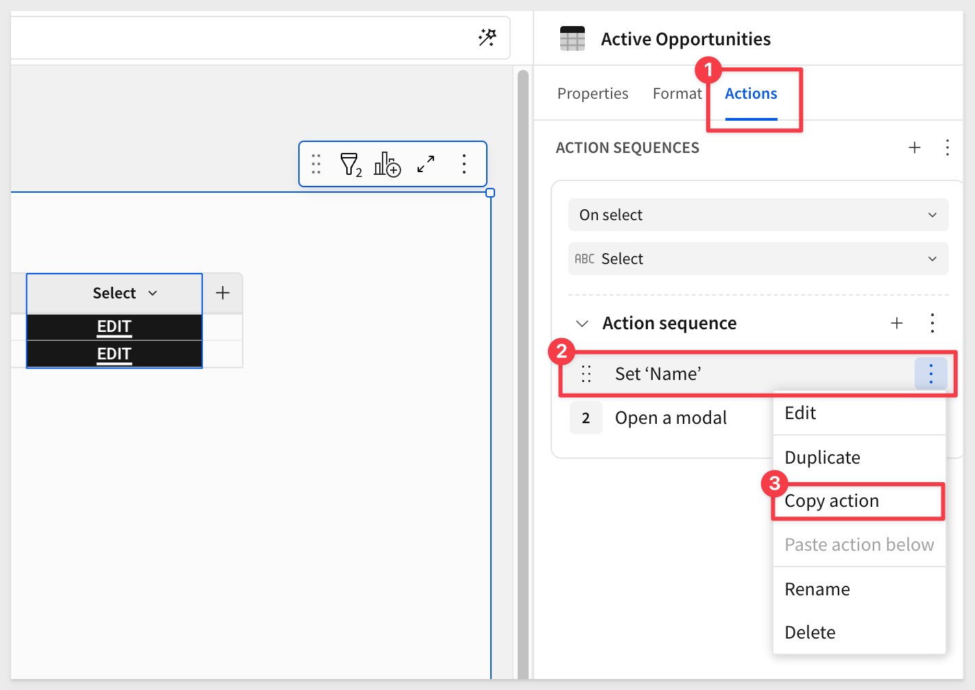 In the Actions panel, action sequences are no longer added and grouped based on trigger type (On select, On change, On click, etc.).