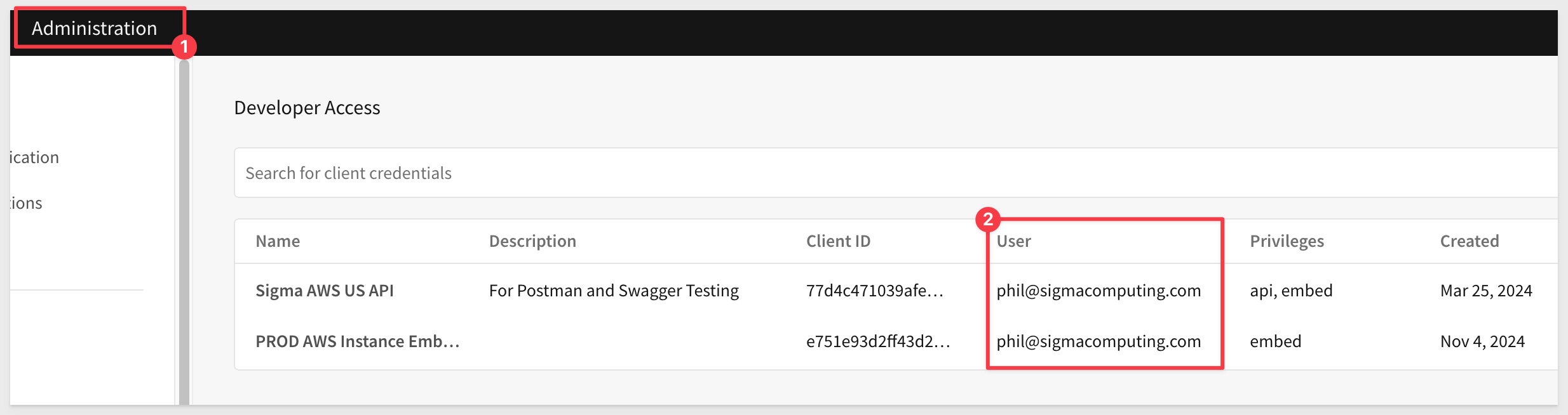 On the Developer access page in the Administration portal, the owner of each set of developer credentials is now identified by email instead of by `user name.