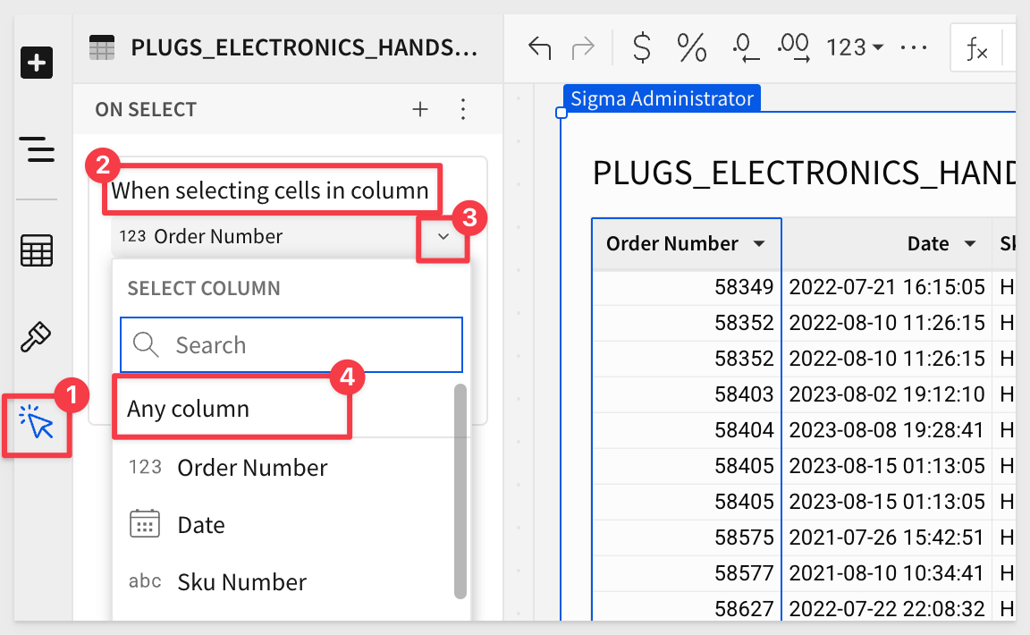 1: In the When selecting cells in column field, select Any column to trigger an action sequence when a user selects a cell in any column.