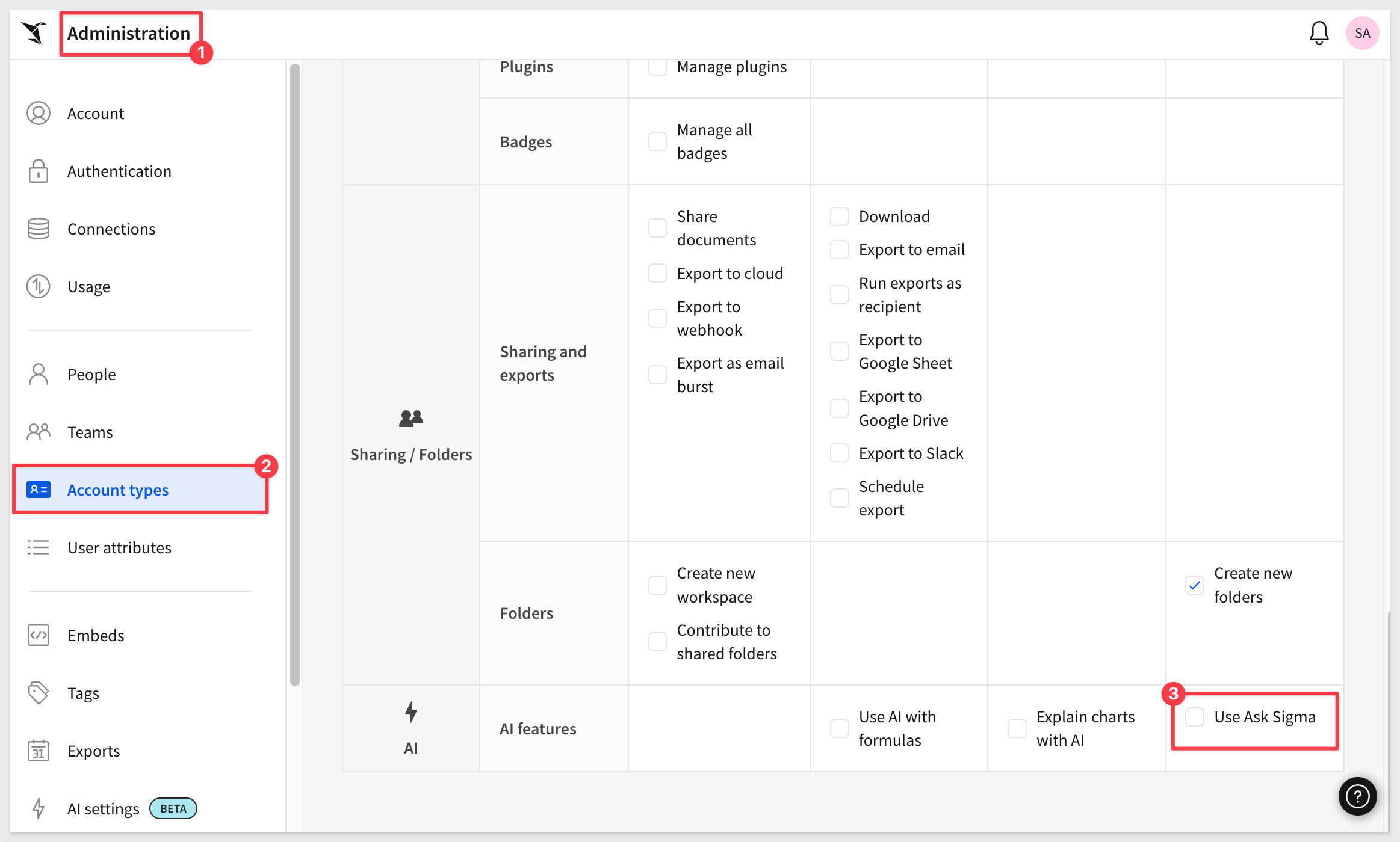 To enable Ask Sigma for users who did not previously have access, update their account types to add the permission:
