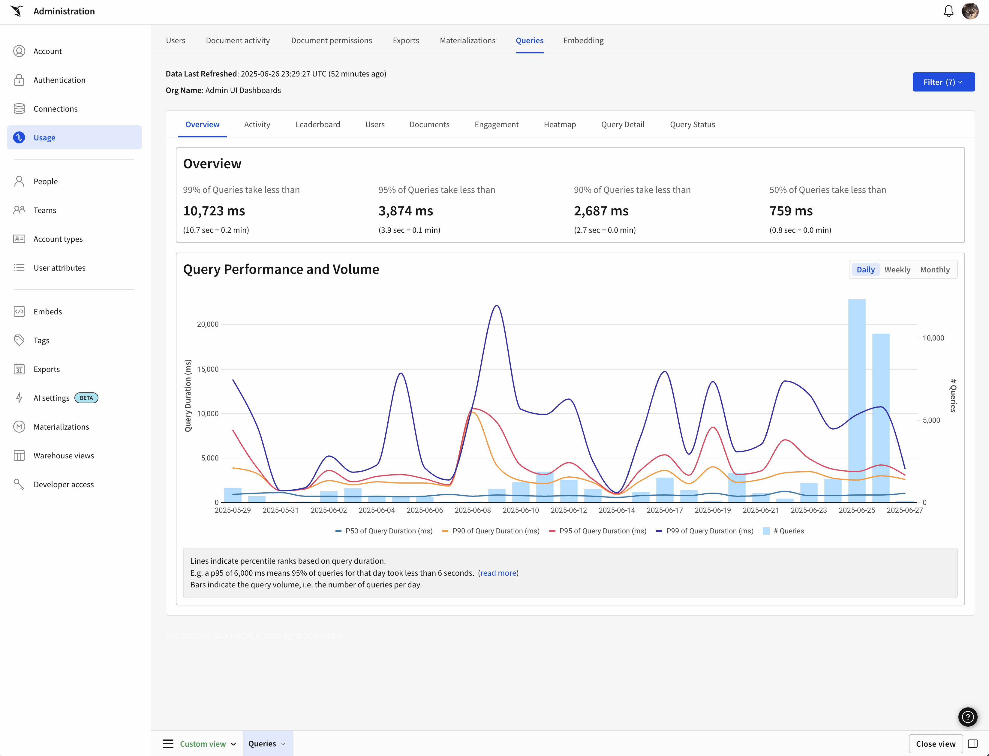 To view insights into how your organization uses Sigma and data on your queries, embeds, materializations, and more, go to Administration > Usage.