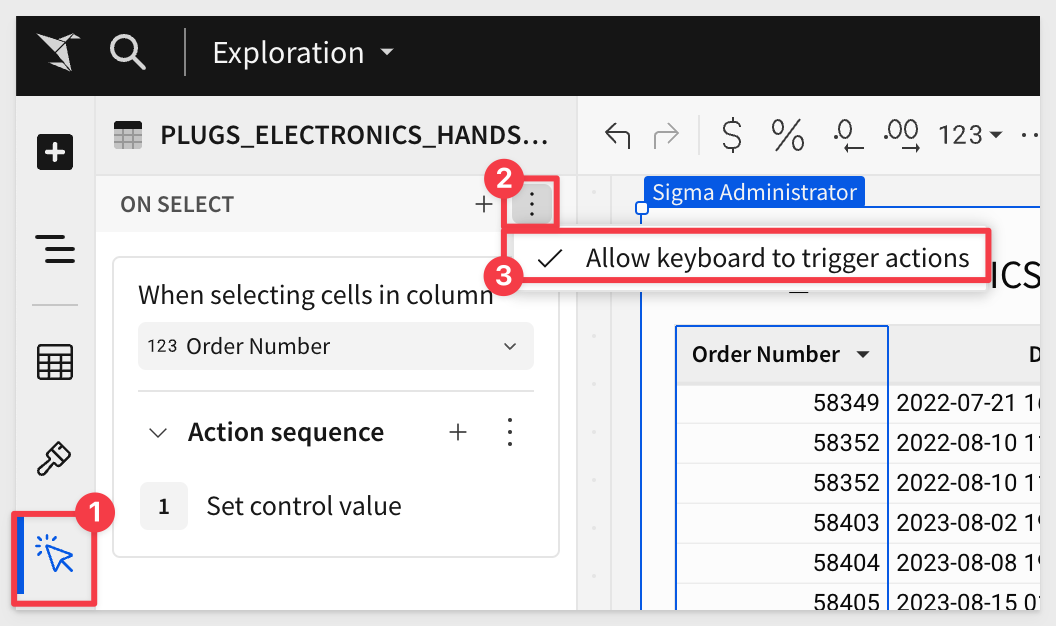2: In the element's Action panel, click the "three dots" to open the menu, then select or deselect Allow keyboard to trigger actions to control whether keyboard navigation within the element can trigger action sequences.
