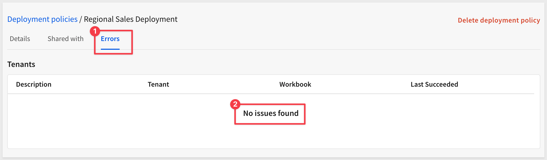 If any deployments fail, you can check for errors in the deployment policy's Errors tab: