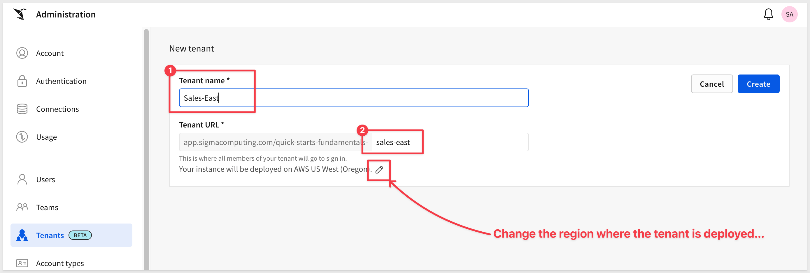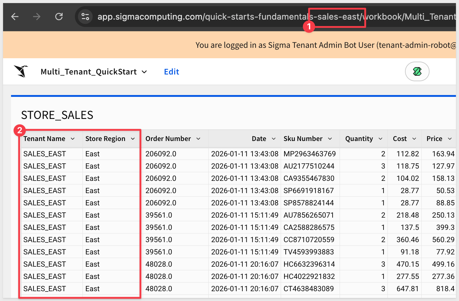 In this QuickStart, we'll demonstrate regional sales team isolation by creating separate tenants for Sales-East and Sales-West. Each regional sales team will have its own isolated Sigma environment with data filtered to show only their territory.