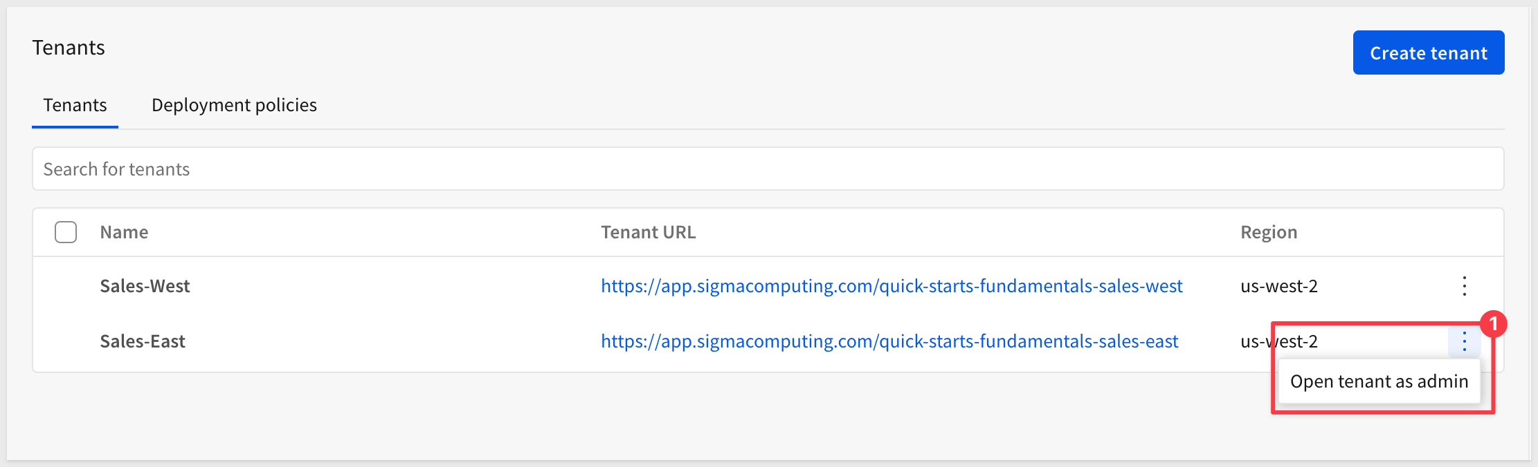 Open the 3-dot menu for Sales-East and select Open tenant as admin: