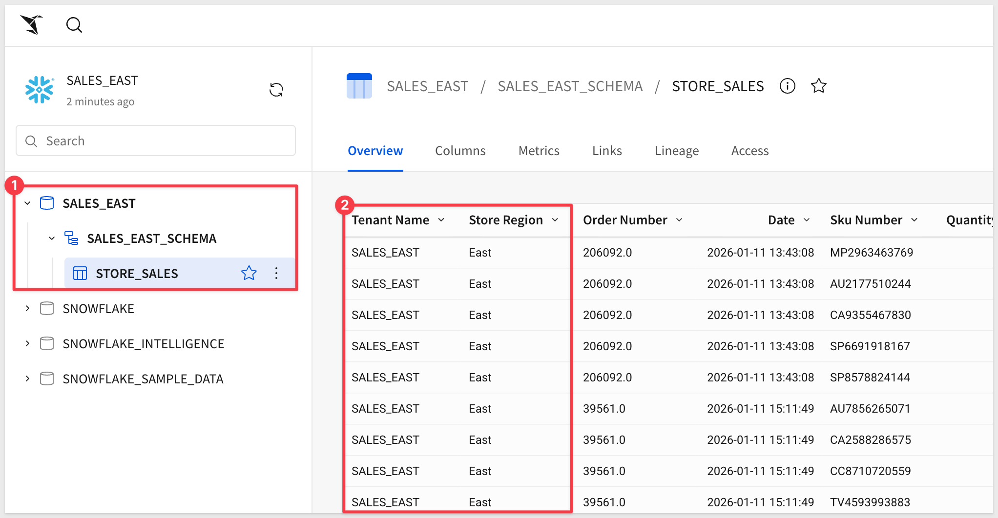 SALES_EAST database and schemaSTORE_SALES table structure with columns matching the CSV formatSALES_EAST_ROLE) and user (SALES_EAST) with appropriate permissionsACCOUNTADMIN role (or your service account role) for parent org workbook development// SALES-EAST REGIONAL DATABASE