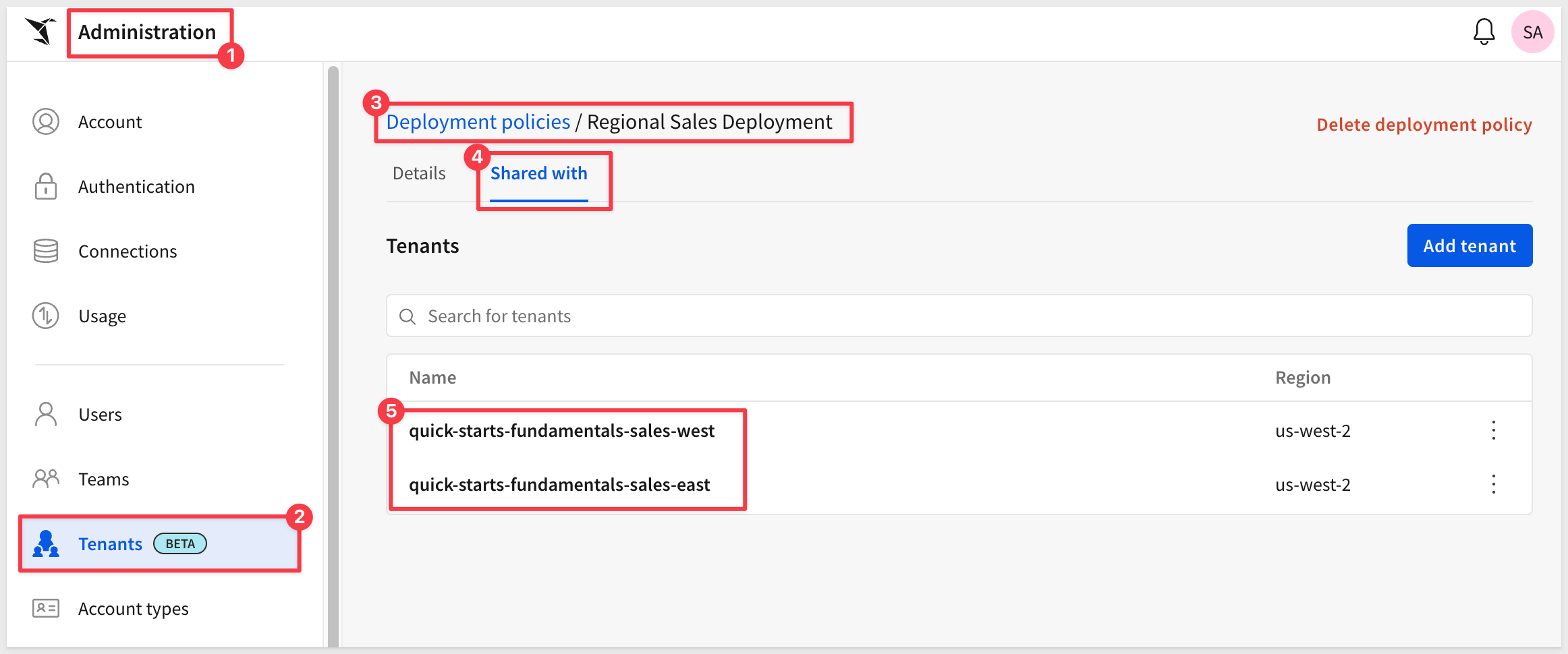 From the parent organization, impersonate the Sales-East tenant using Administration > Tenants as before.
