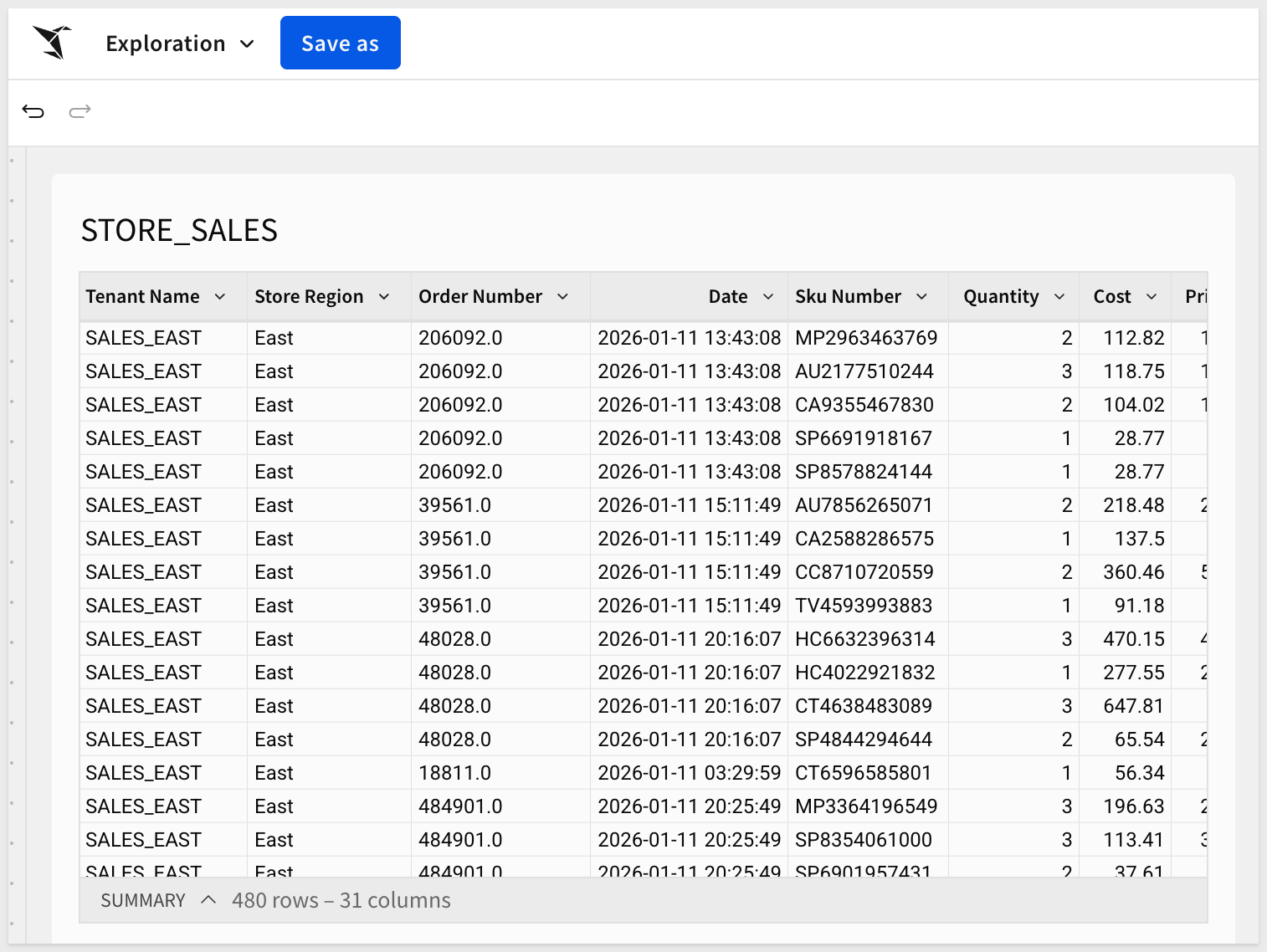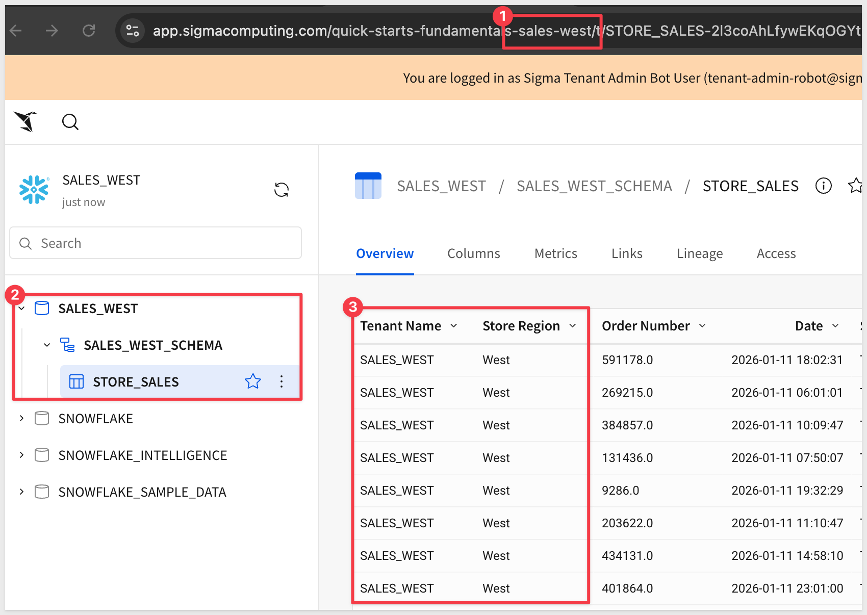 Regional Sales Data connection swapped to the Sales-East connection → queries SALES_EAST.SALES_EAST_SCHEMA.STORE_SALES → shows only Sales-East tenant with East region dataSALES_WEST.SALES_WEST_SCHEMA.STORE_SALES → shows only Sales-West tenant with West region dataThis demonstrates warehouse-level data security - each tenant is restricted to their data through separate Snowflake databases and roles, not just Sigma permissions.