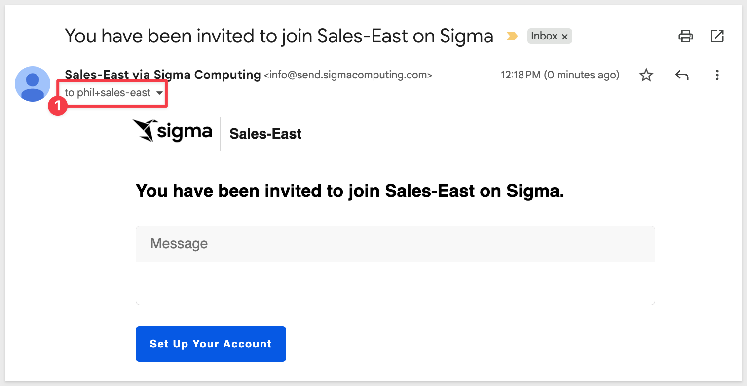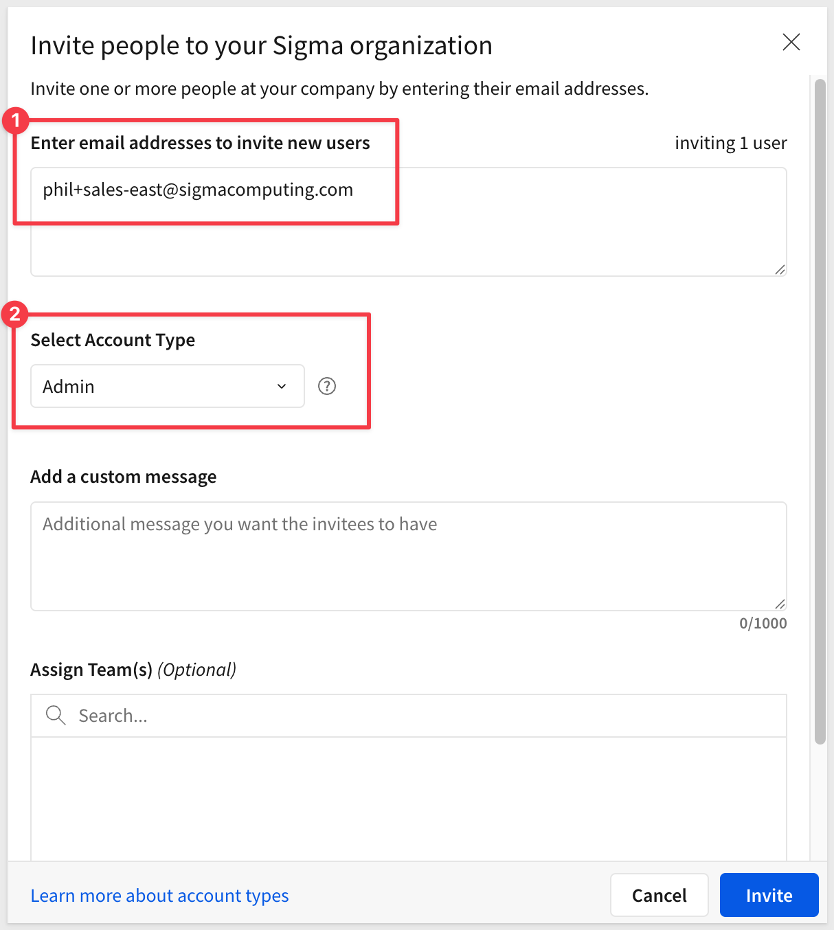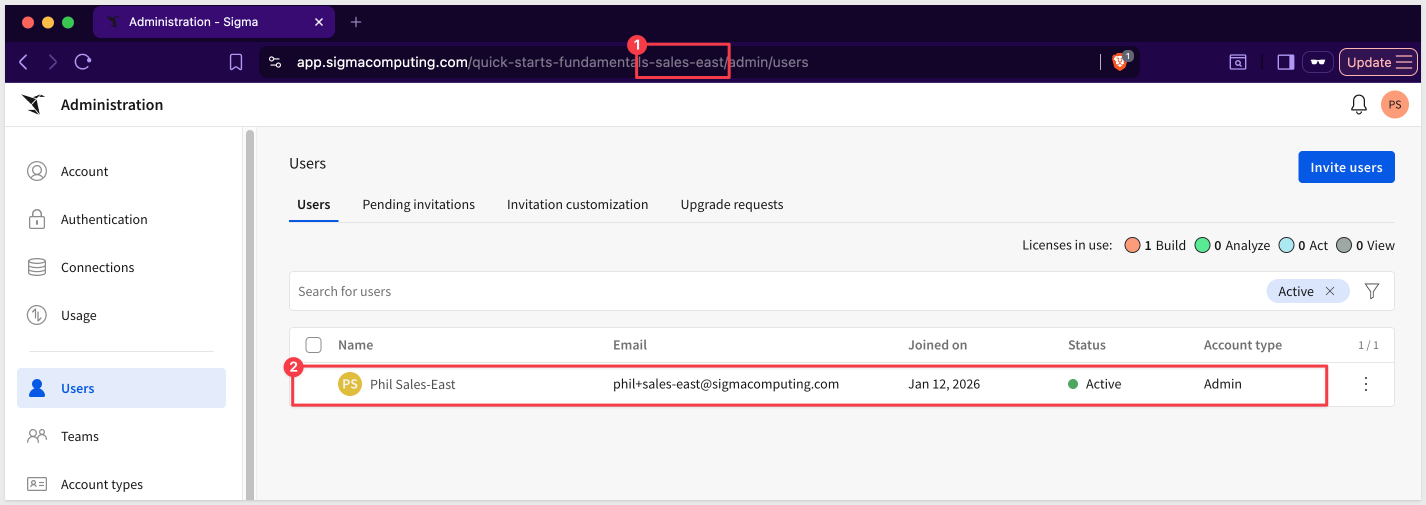 After opening the invitation and completing the new account (in a private browser so we can be logged into two Sigma sessions):
