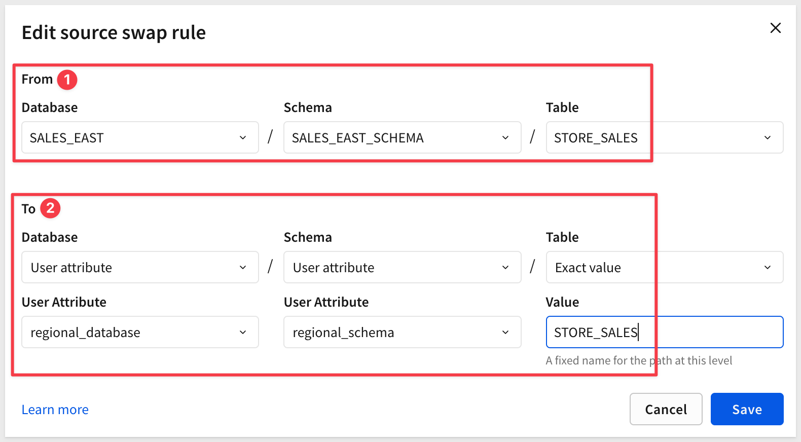 Regional Sales Data → SALES_EAST → SALES_EAST_SCHEMA → STORE_SALESregional_connection user attribute)regional_database user attribute)regional_schema user attribute)regional_connection user attribute)regional_database user attribute)regional_schema user attribute)This ensures that each regional sales team only sees their own data, even though they're using the same workbook. The swap happens dynamically at query time based on which tenant is viewing the workbook.