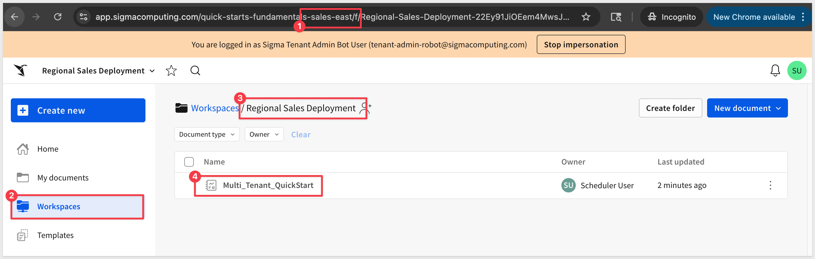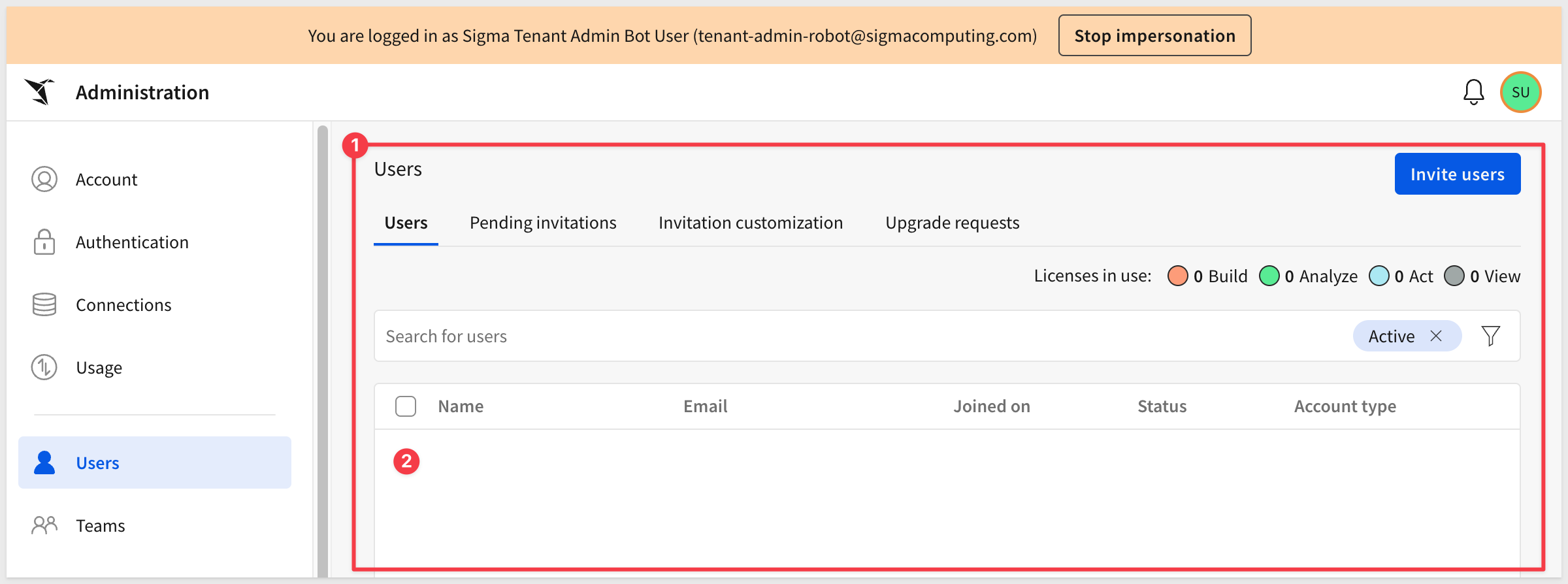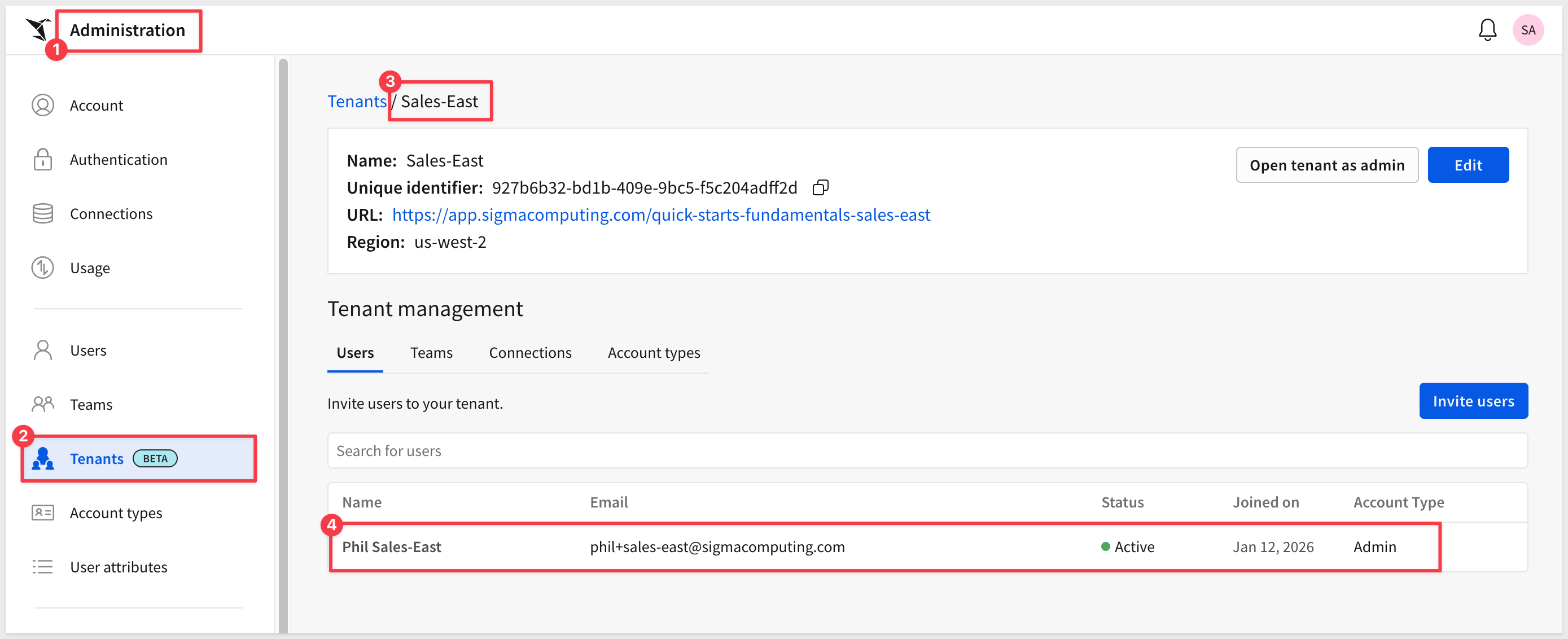 Click Stop impersonation to return to the parent Sigma instance. We can see the new admin user listed under their tenant: