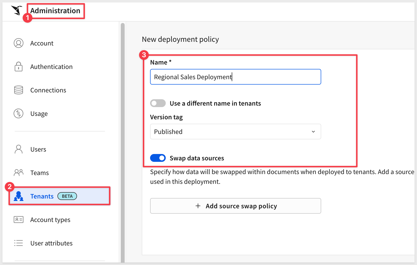 Connection Swap Policies: Automatically route each tenant to their appropriate data connection. When a workbook is deployed, the connection swaps from the parent's template connection to each tenant's specific data source.