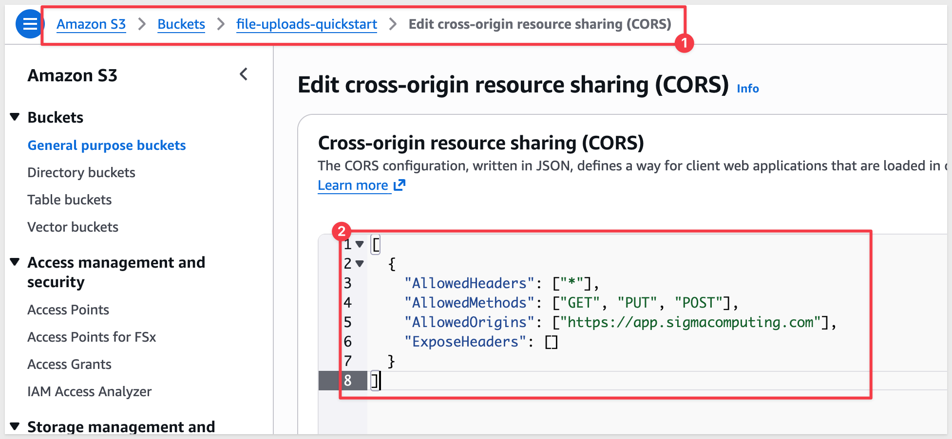 Before configuring Sigma's storage integration, you need to set up the AWS infrastructure that will store your uploaded files. This involves creating an S3 bucket, IAM policies, and roles with proper permissions.