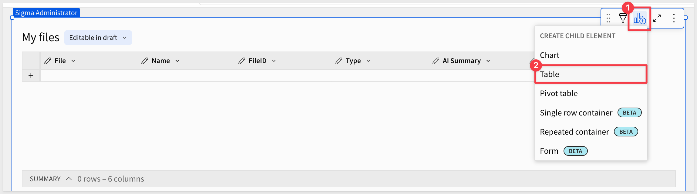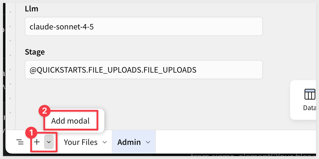 listagg() to combine all file names and AI descriptions into a single text string{{CollectiveInquiry}} control parameter - if the user typed a question, it proceeds; if empty, shows "Ask optional question above"ai_complete() for analysisClick Data from the element bar, then select Table > SQL.