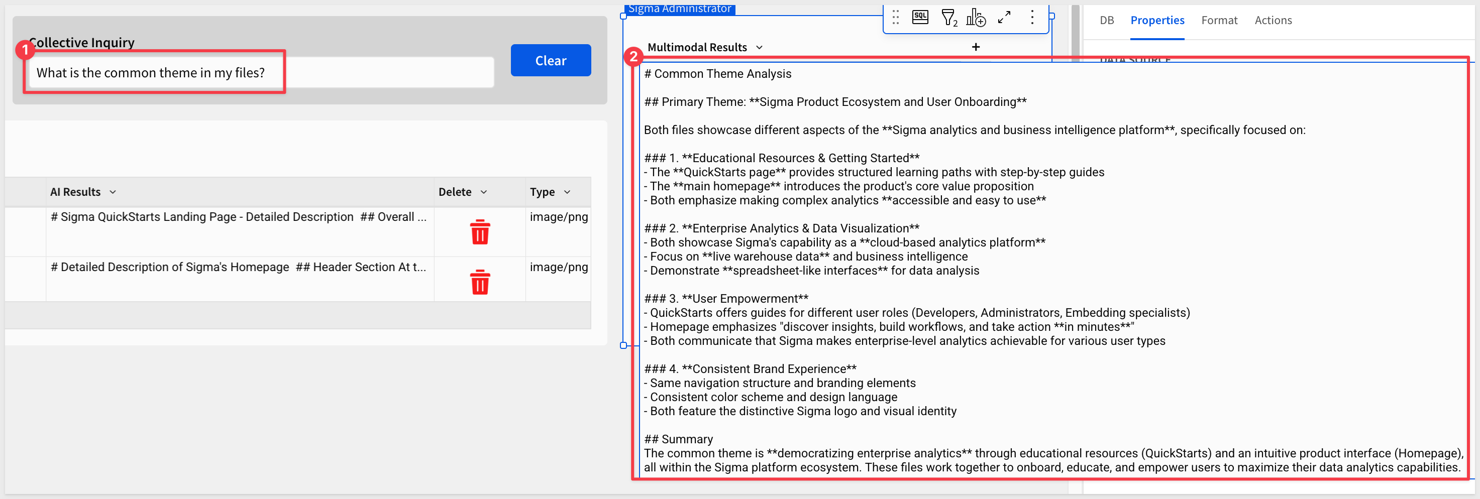 To make the example really simple, we created two screenshots, one of Sigma's homepage and another of the QuickStarts homepage. We will upload them both and then ask the AI to compare them, just to see what happens.