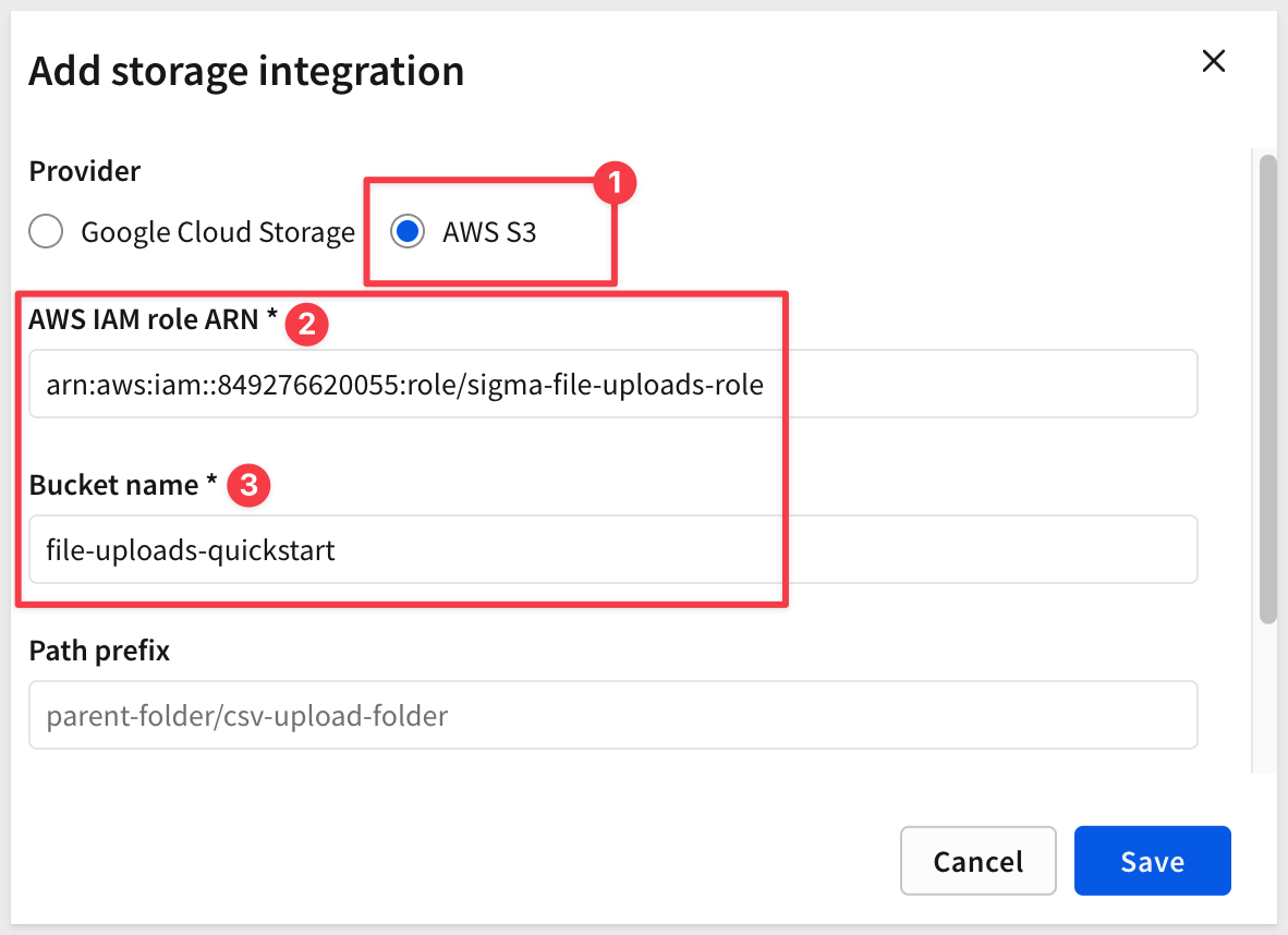 AWS S3arn:aws:iam::123456789012:role/sigma-file-uploads-role)file-uploads-quickstart)sigma-uploads/)