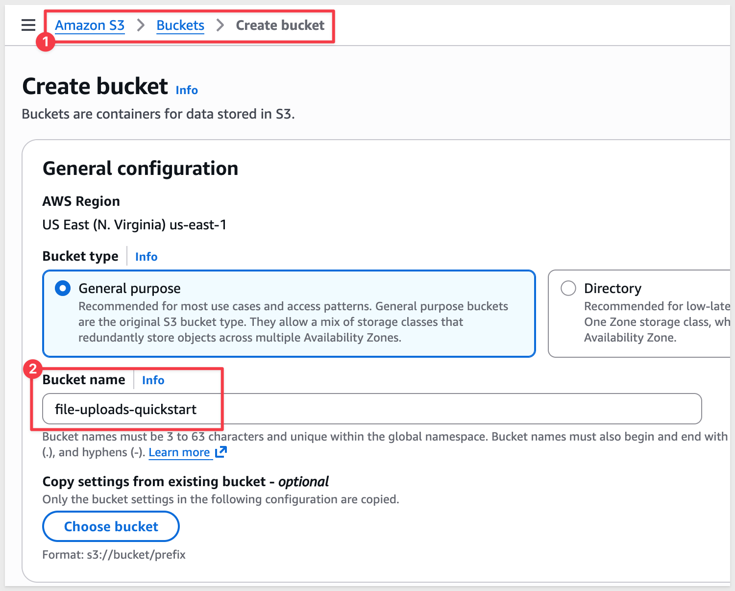 file-uploads-quickstart)Scroll all the way down the page and click Create bucket.