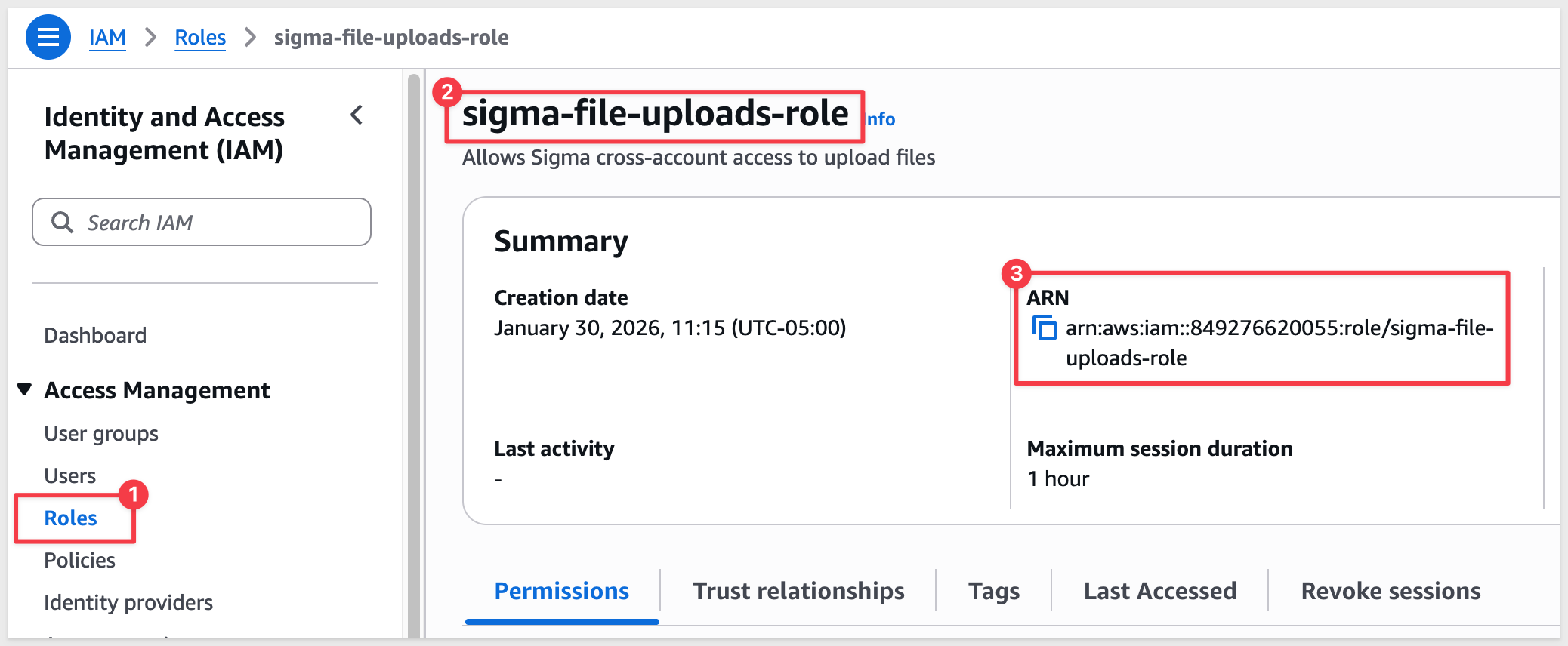 After creating the role, search for it by name (sigma-file-uploads-role), click on it and copy the Role ARN - you'll need this when configuring Sigma.