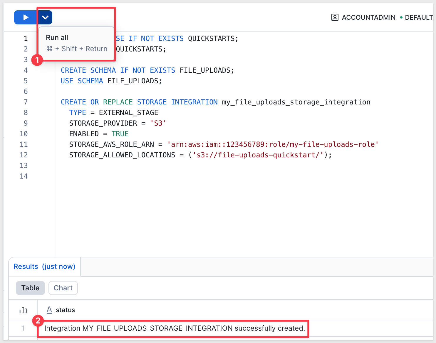 Run the following SQL to create a storage integration mapped to your AWS S3 bucket: