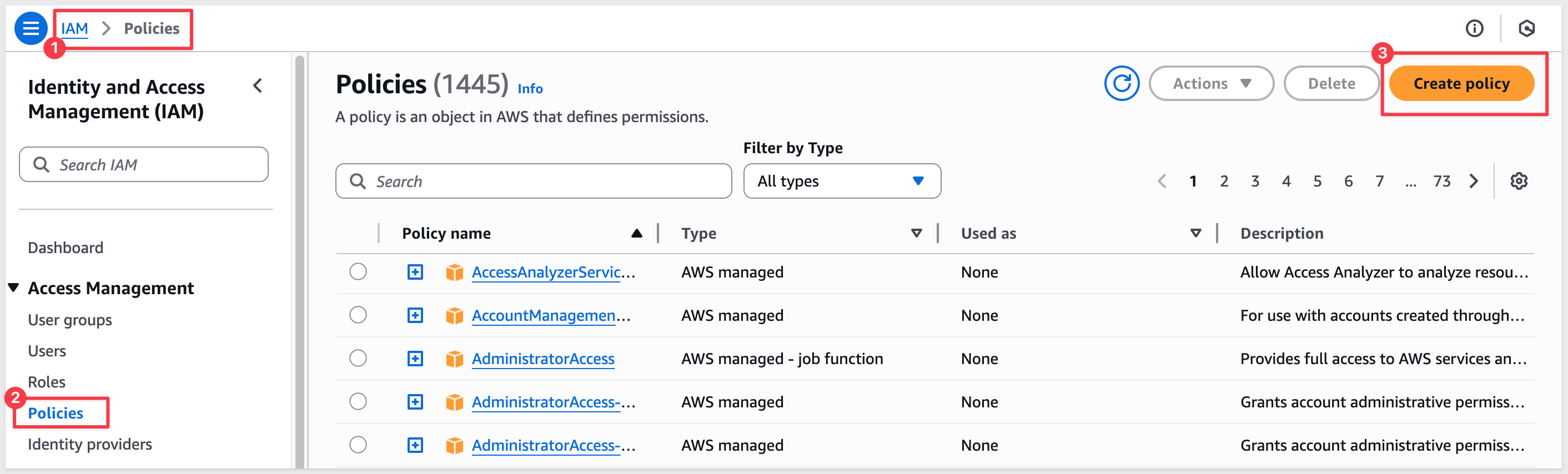 Navigate to IAM > Policies and click Create policy: