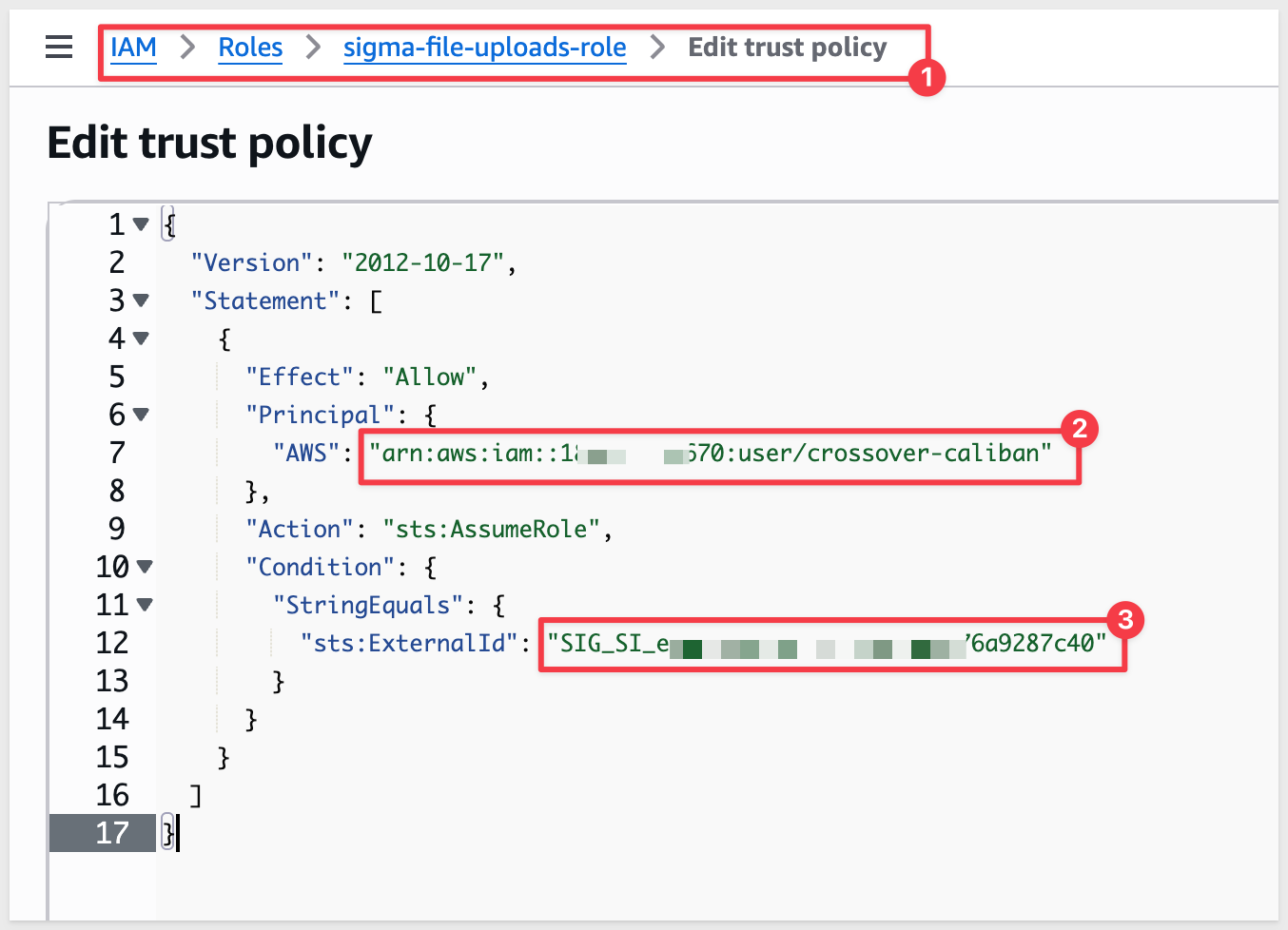 In AWS Console > IAM > Roles > sigma-file-uploads-role > Trust relationships, verify BOTH:
