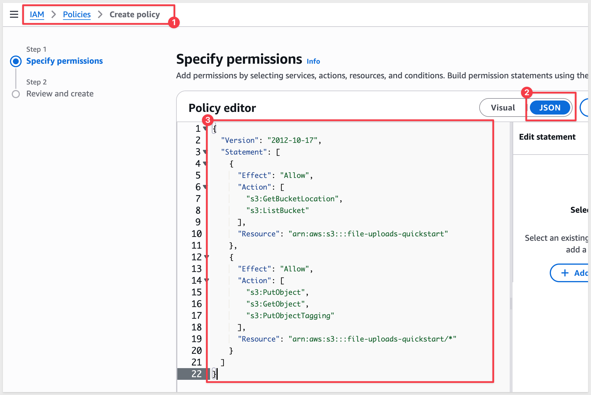 Switch to the JSON tab and replace the existing code with the following policy document: