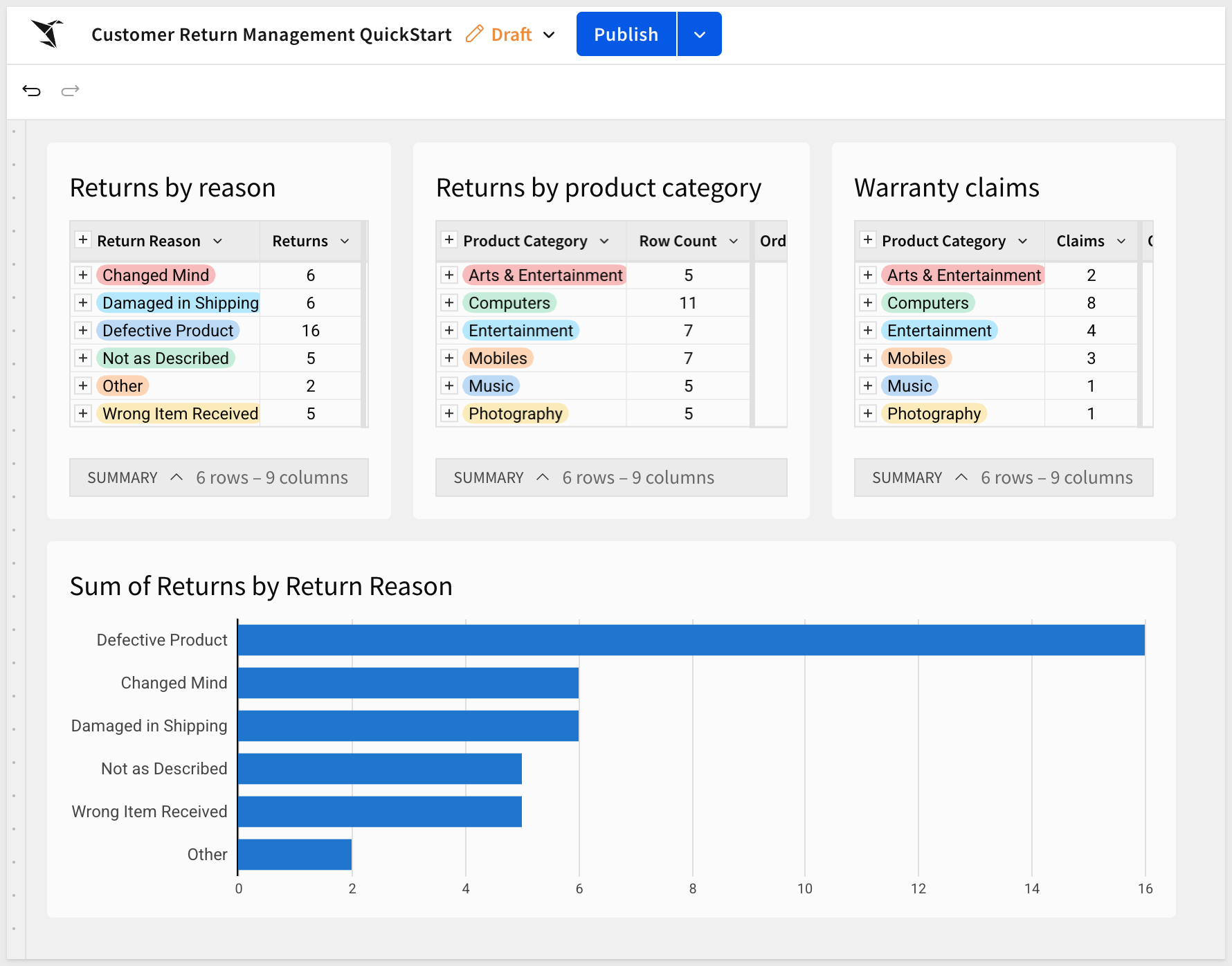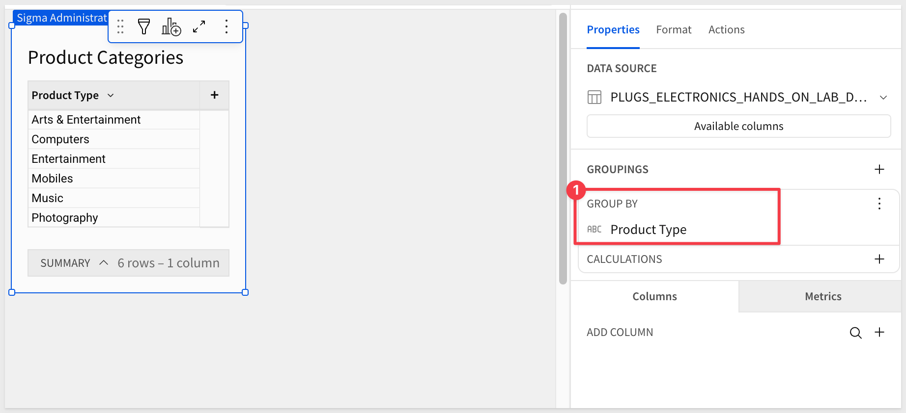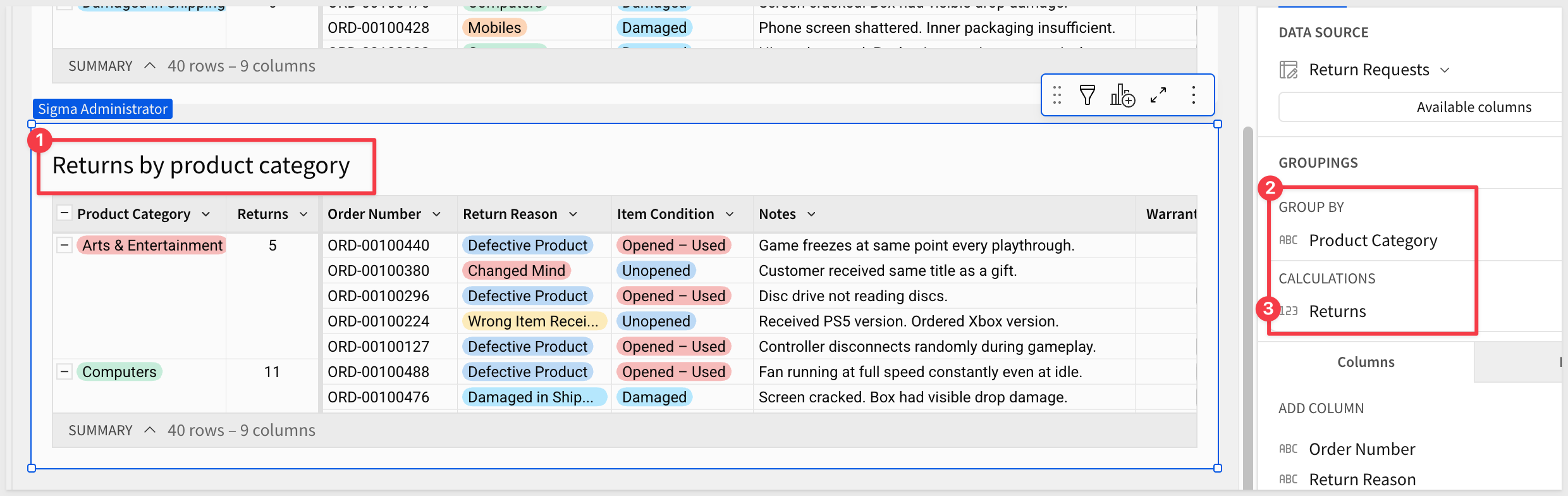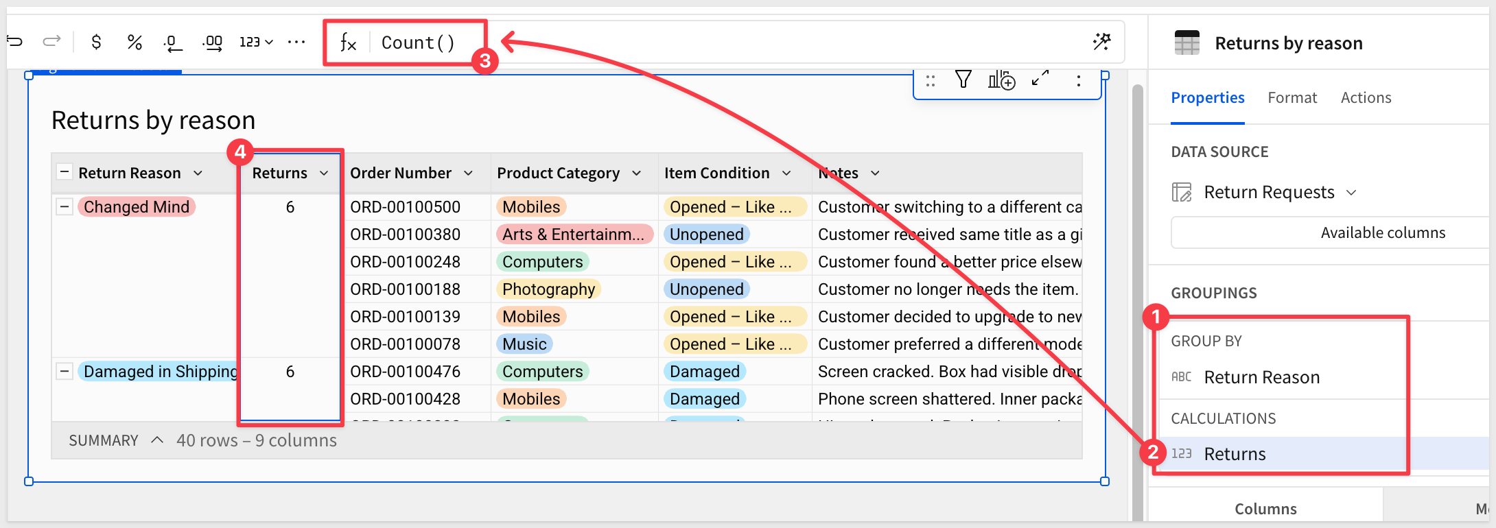 In the Element panel, drag Product Category to GROUPINGS. Add Row count and rename it Returns. Sort descending by Returns.