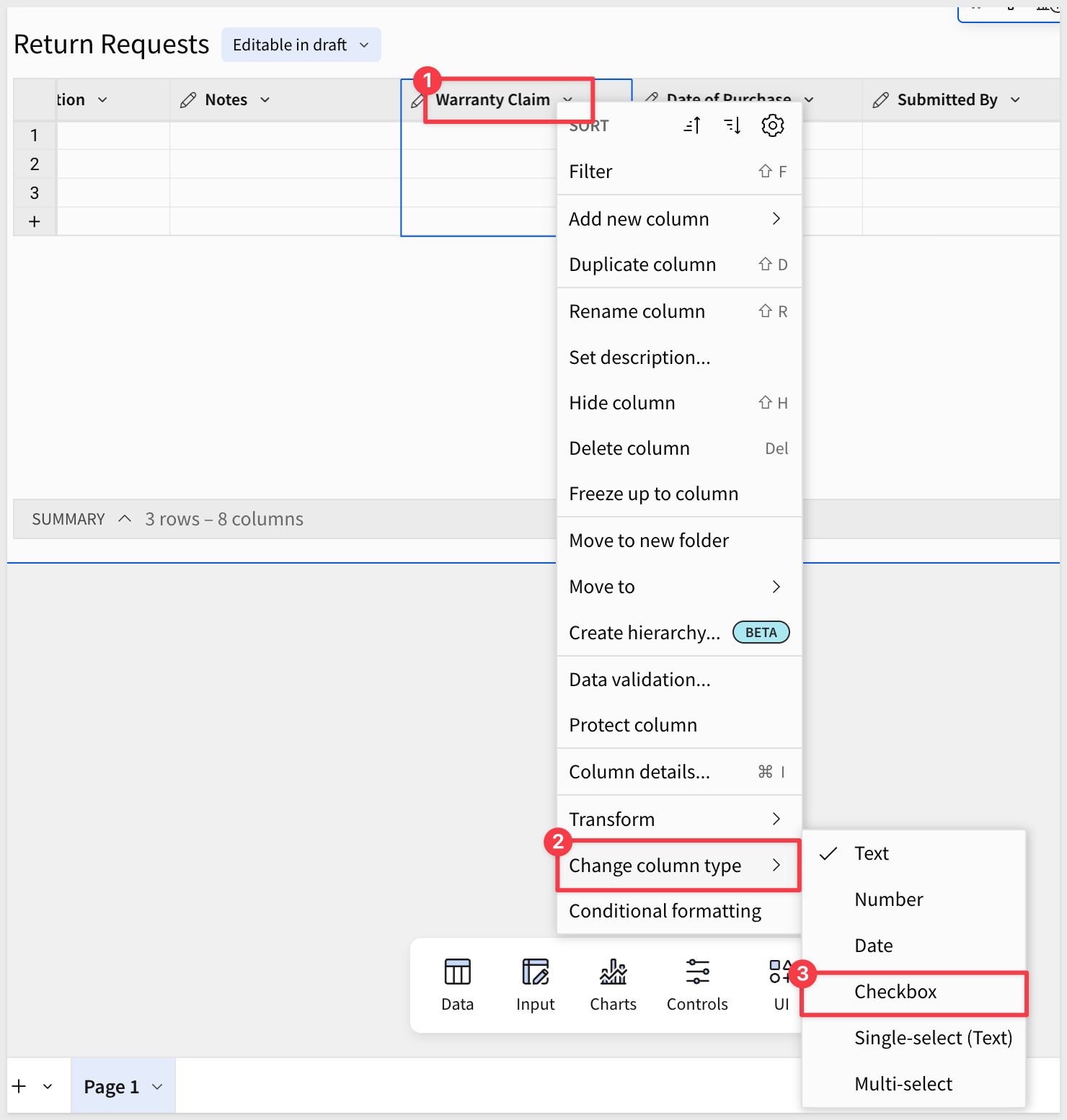 Click the Warranty Claim column header, open the column menu, select Change column type, and set the type to Checkbox: