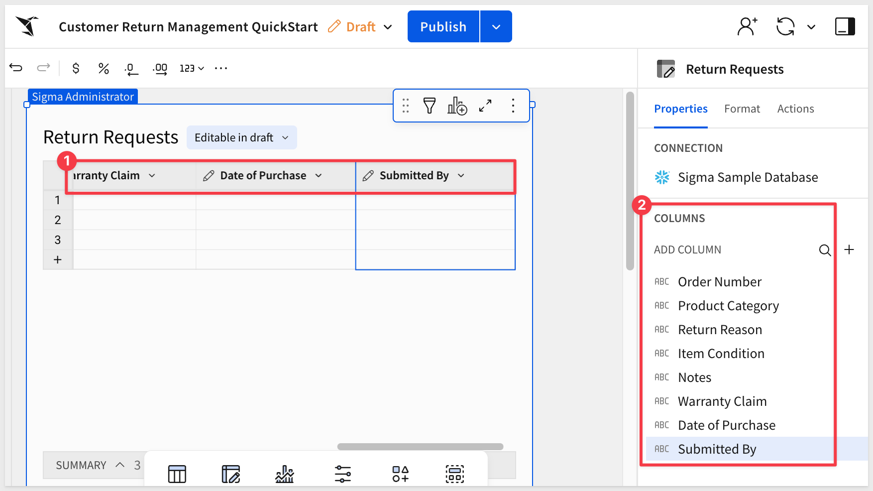 Notice that Sigma also created two actions on the Submit button automatically: one to insert a row into the input table and one to clear the form after submission. You don't need to configure these manually: