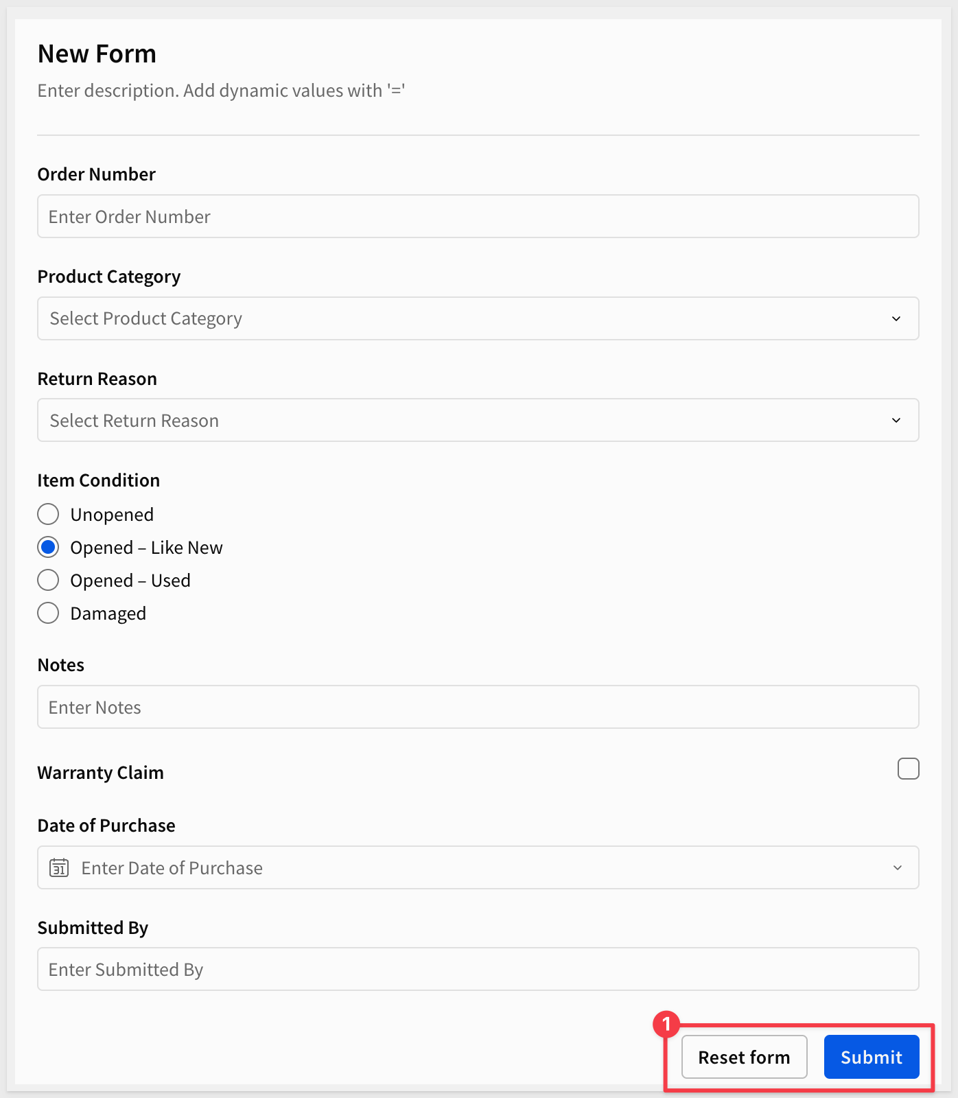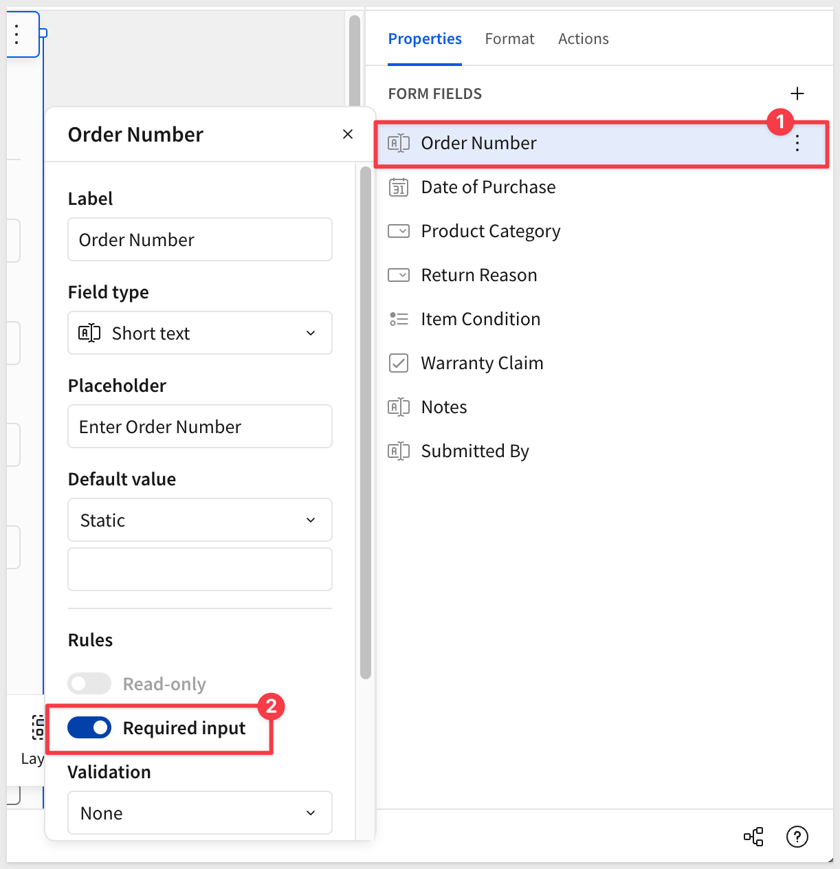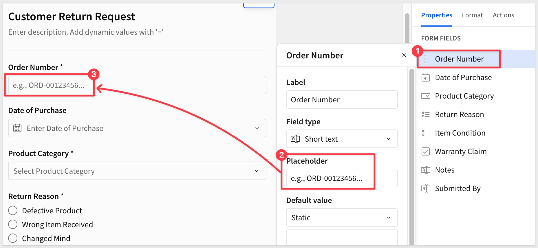 Order NumberDate of PurchaseProduct CategoryReturn ReasonItem ConditionWarranty ClaimNotesSubmitted ByBy reordering the column list, the form automatically adjusts for us: