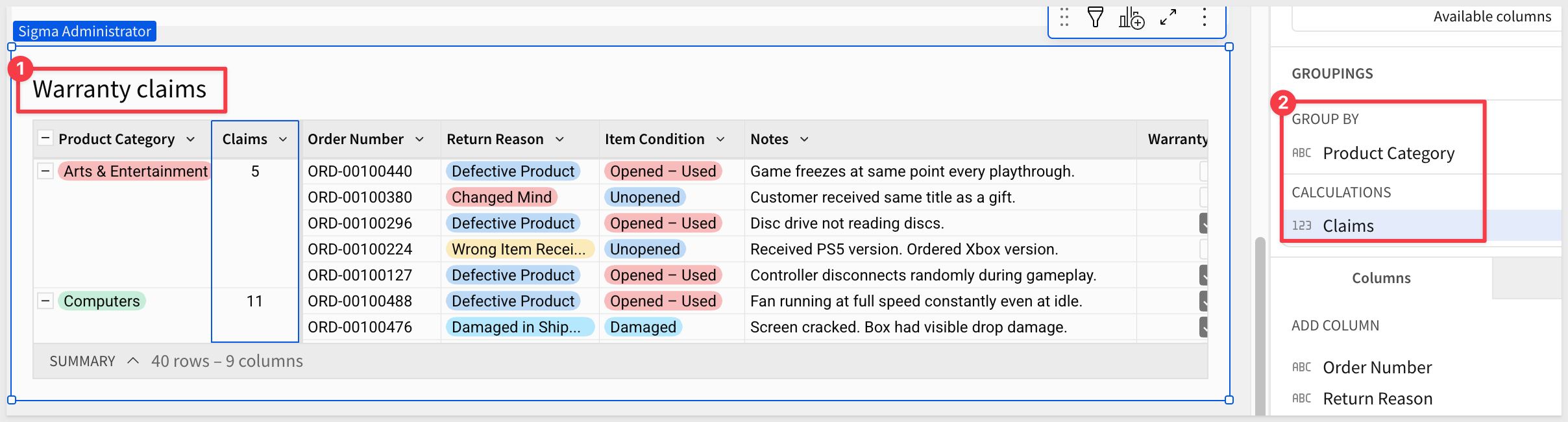 Drag Product Category to GROUPINGS. Add Row count and rename it Claims: