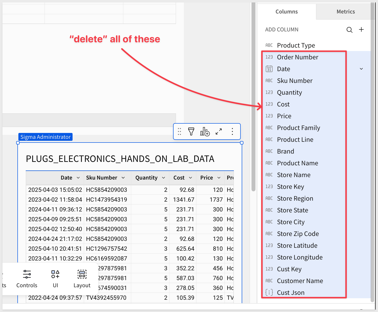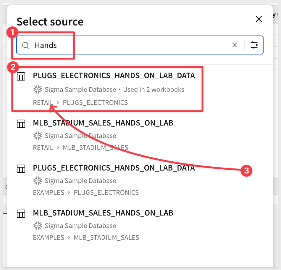 It is easier to just search for Hands and select to PLUGS_ELECTRONICS_HANDS_ON_LAB_DATA from the RETAIL schema: