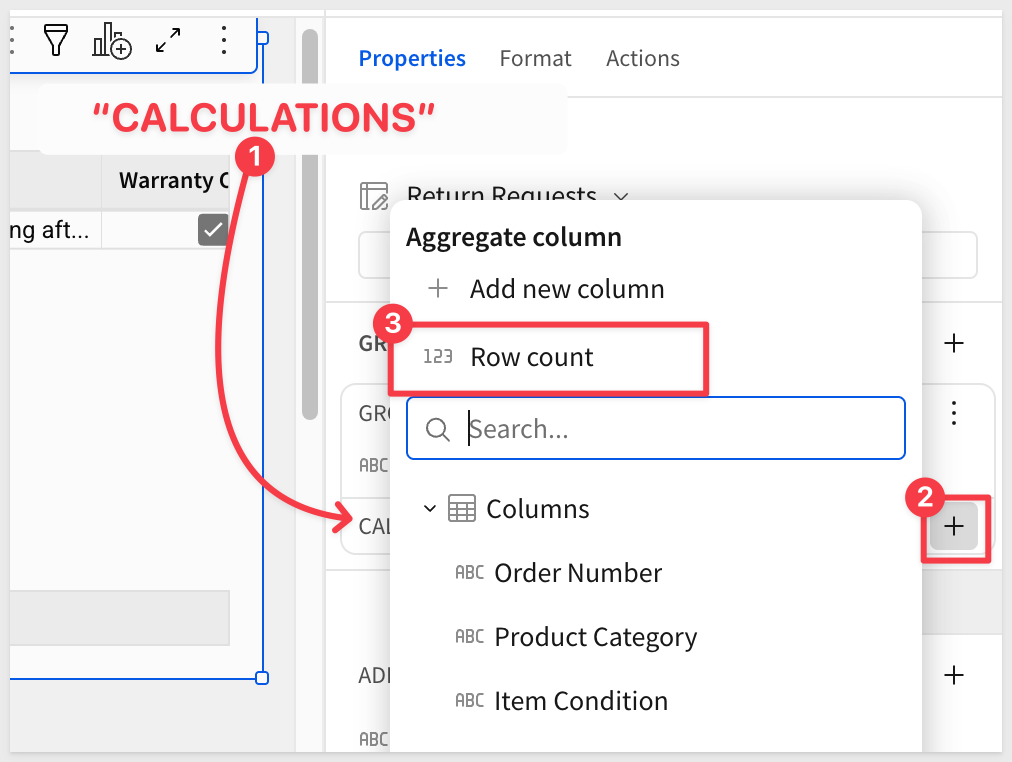 Add a row count by clicking + next to CALCULATIONS and selecting Row count. Rename that column Returns: