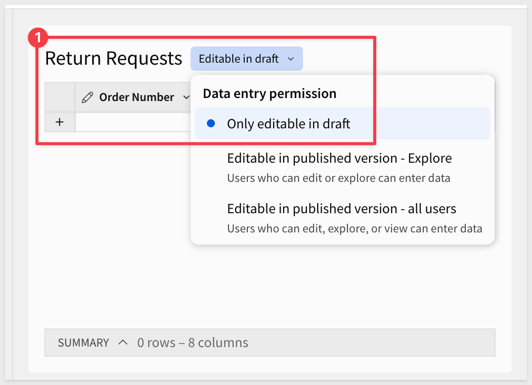 Confirm the Return Requests input table is set to allow Draft edits by clicking the input table settings icon and checking the Governance options: