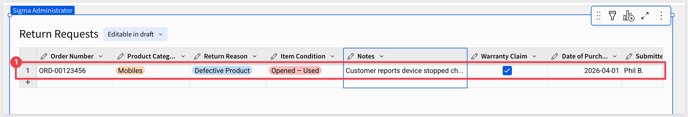 Sigma automatically creates a form bound to the Return Requests input table. Every column is mapped to a form field — including the types and validation rules we just set.
