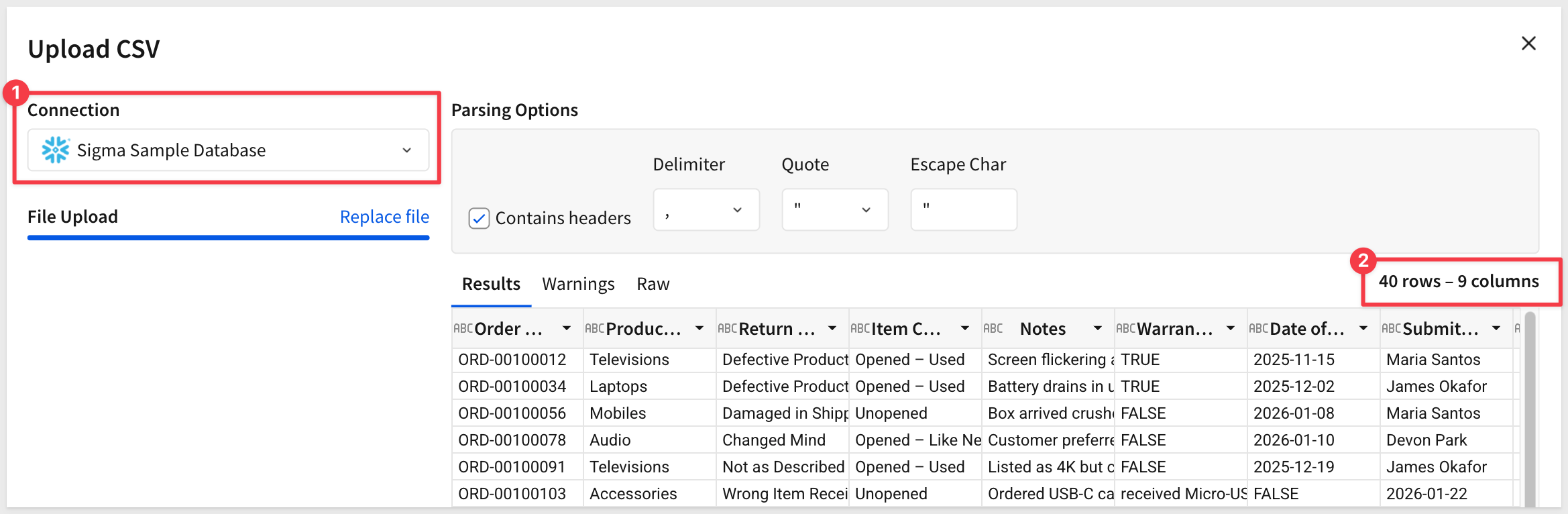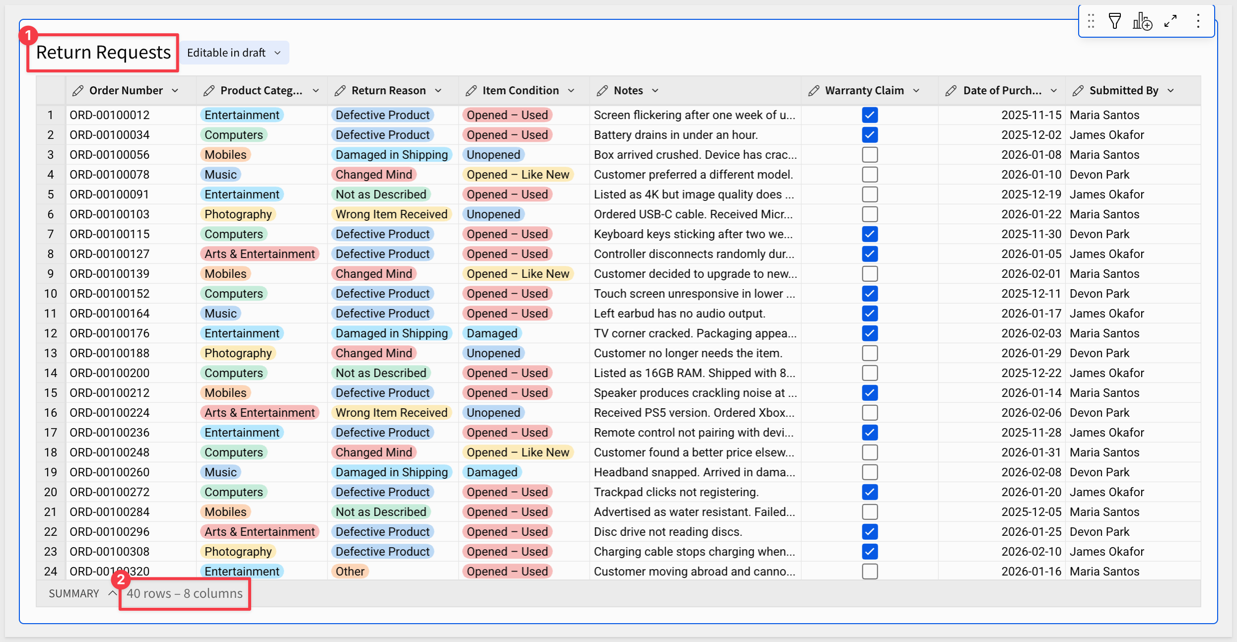 Once imported, the input table will have 40 rows across multiple product categories and return reasons — enough to make the analysis views meaningful: