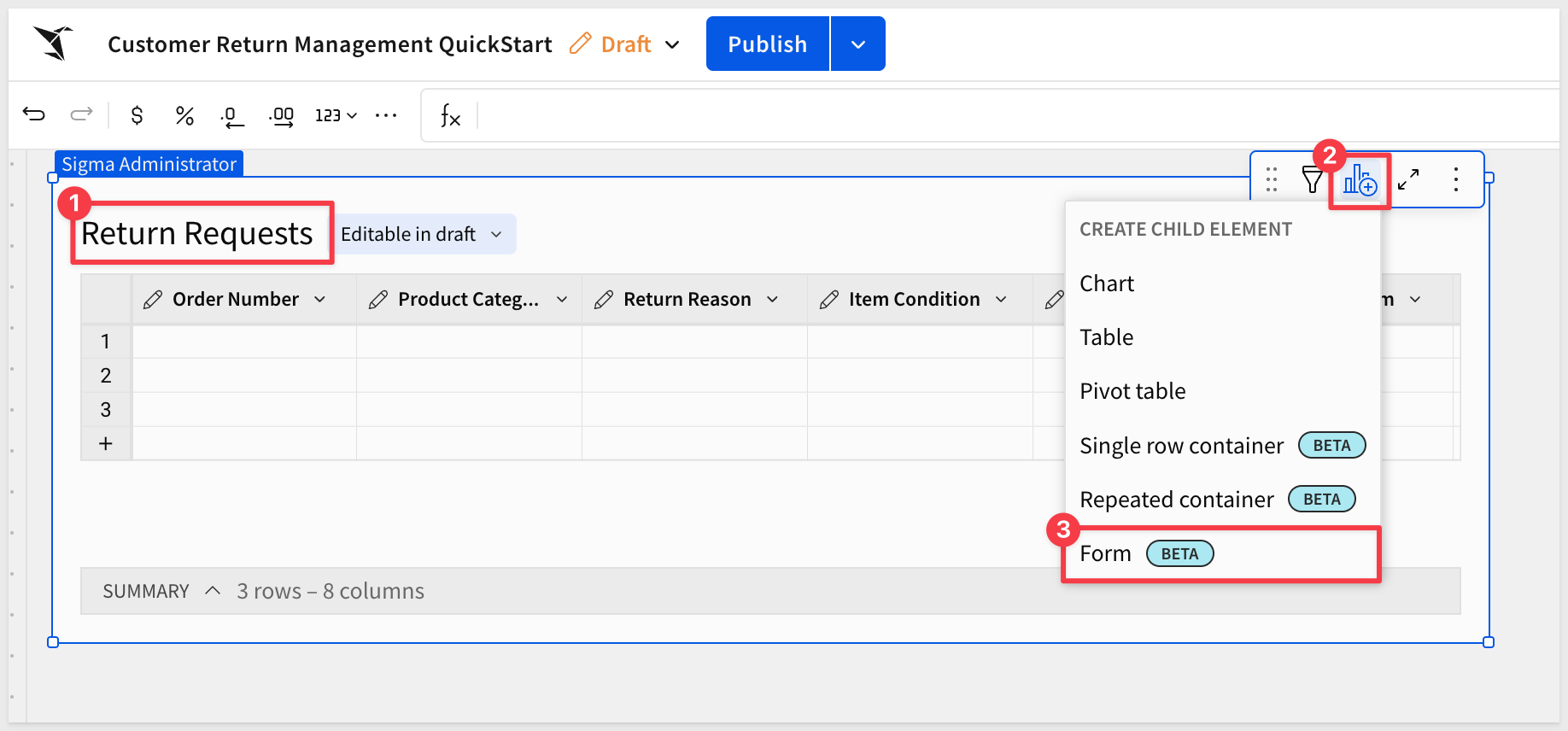 On the Return Requests page, from the Element bar, add a Child table from the Return Requests input table.