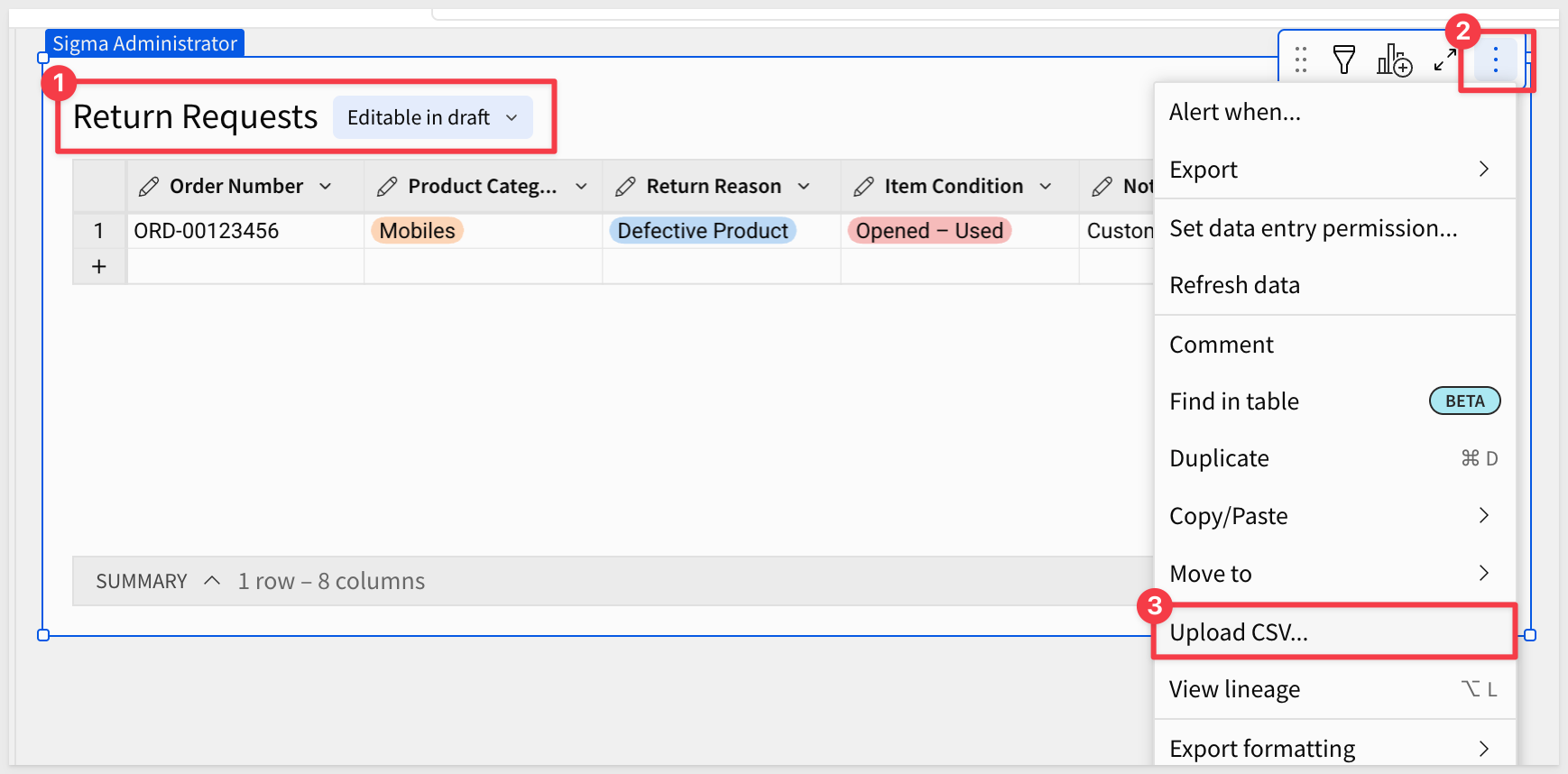 On the Return Requests page, open the input table menu and select Upload CSV: