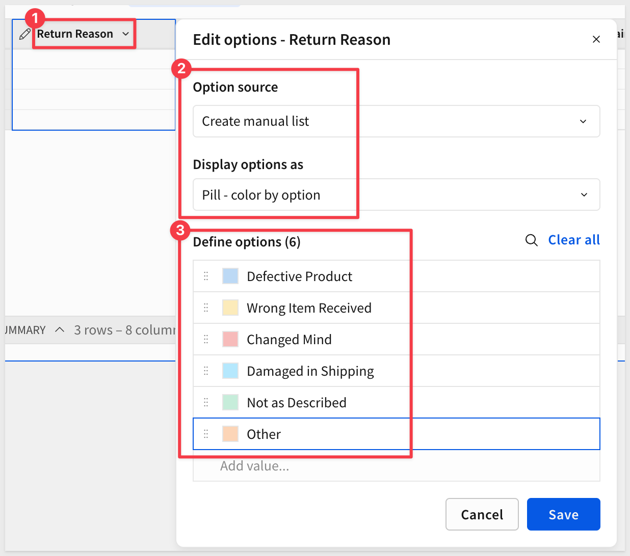 Select the Return Reason column header menu and change the column type to Single-select.