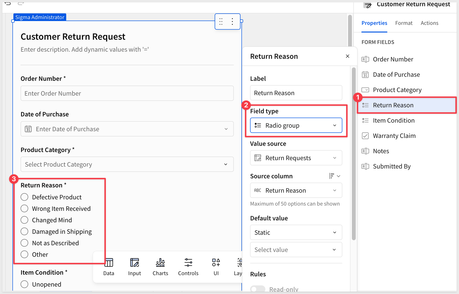 Click the Return Reason field. In the Element panel, change the Field type to Radio group: