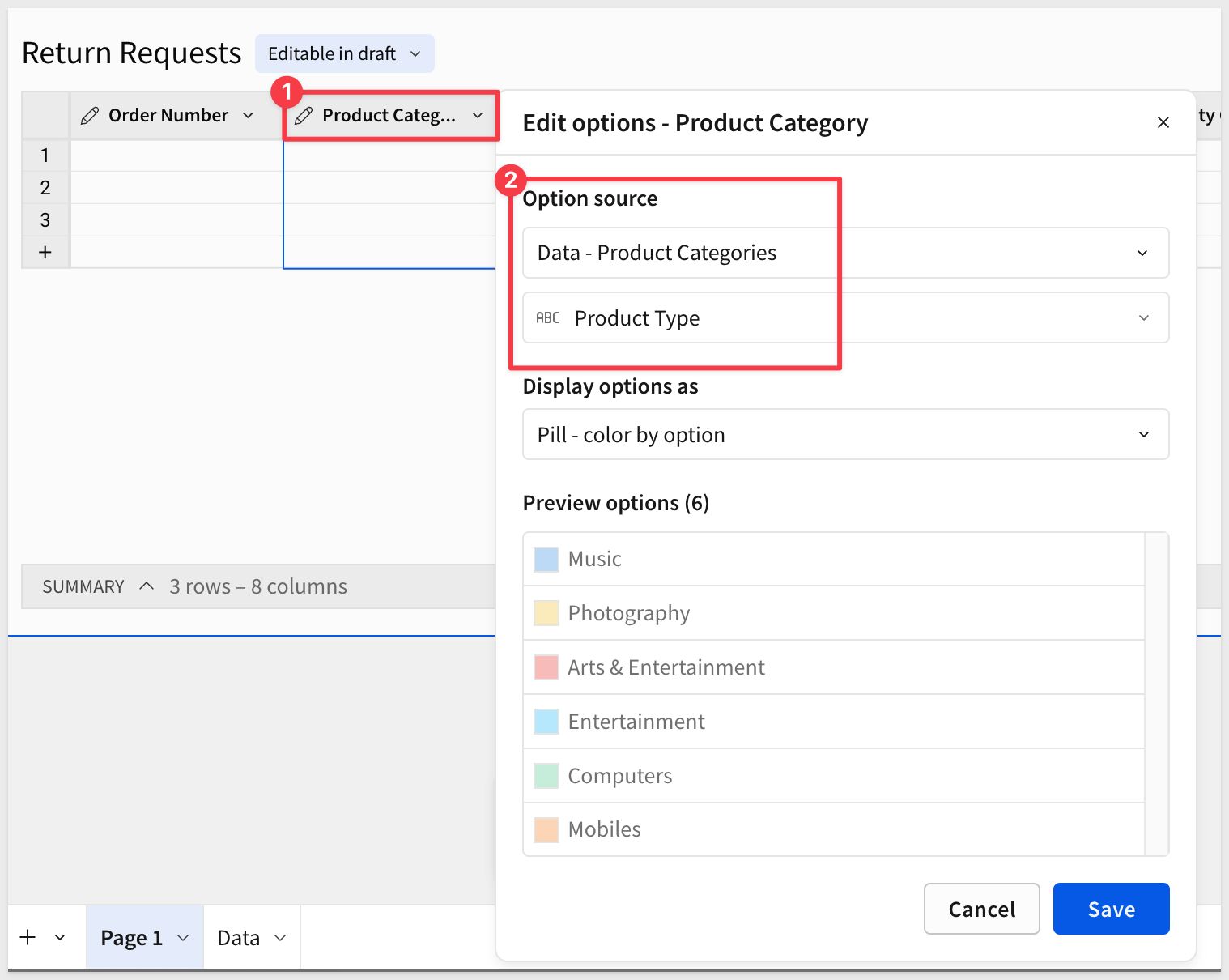 Back on Page 1, change the Product Category column to Single-select.