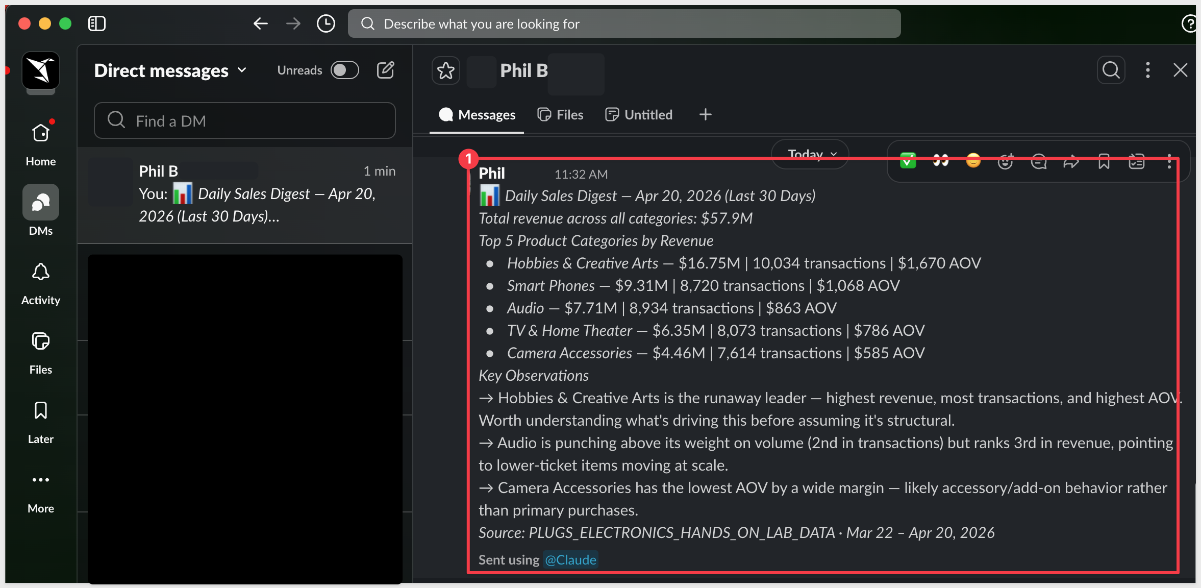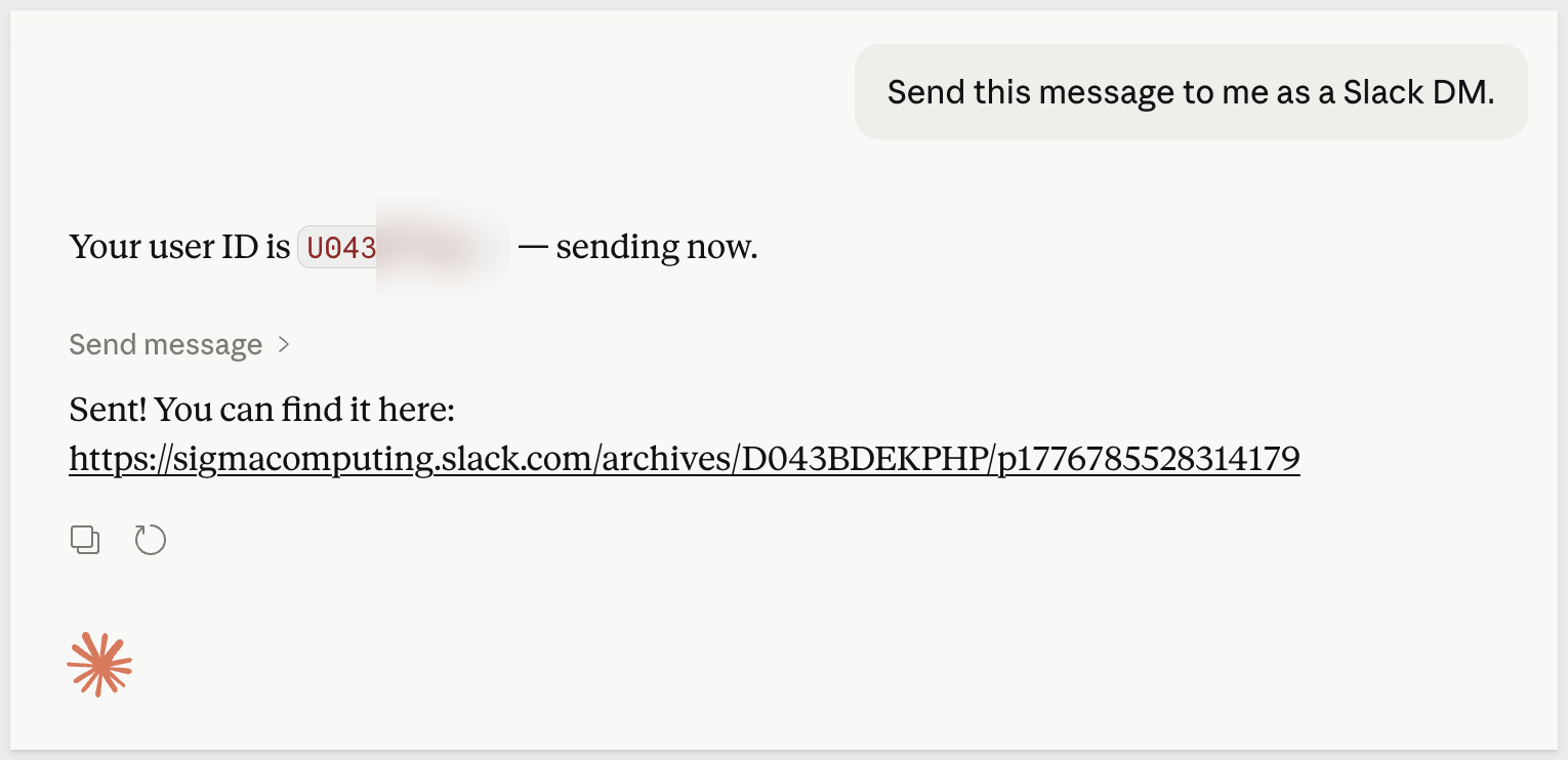 Claude will use the Slack connector to locate your Slack user ID and deliver the message. Check your Slack DMs to confirm it arrived and the formatting renders correctly: