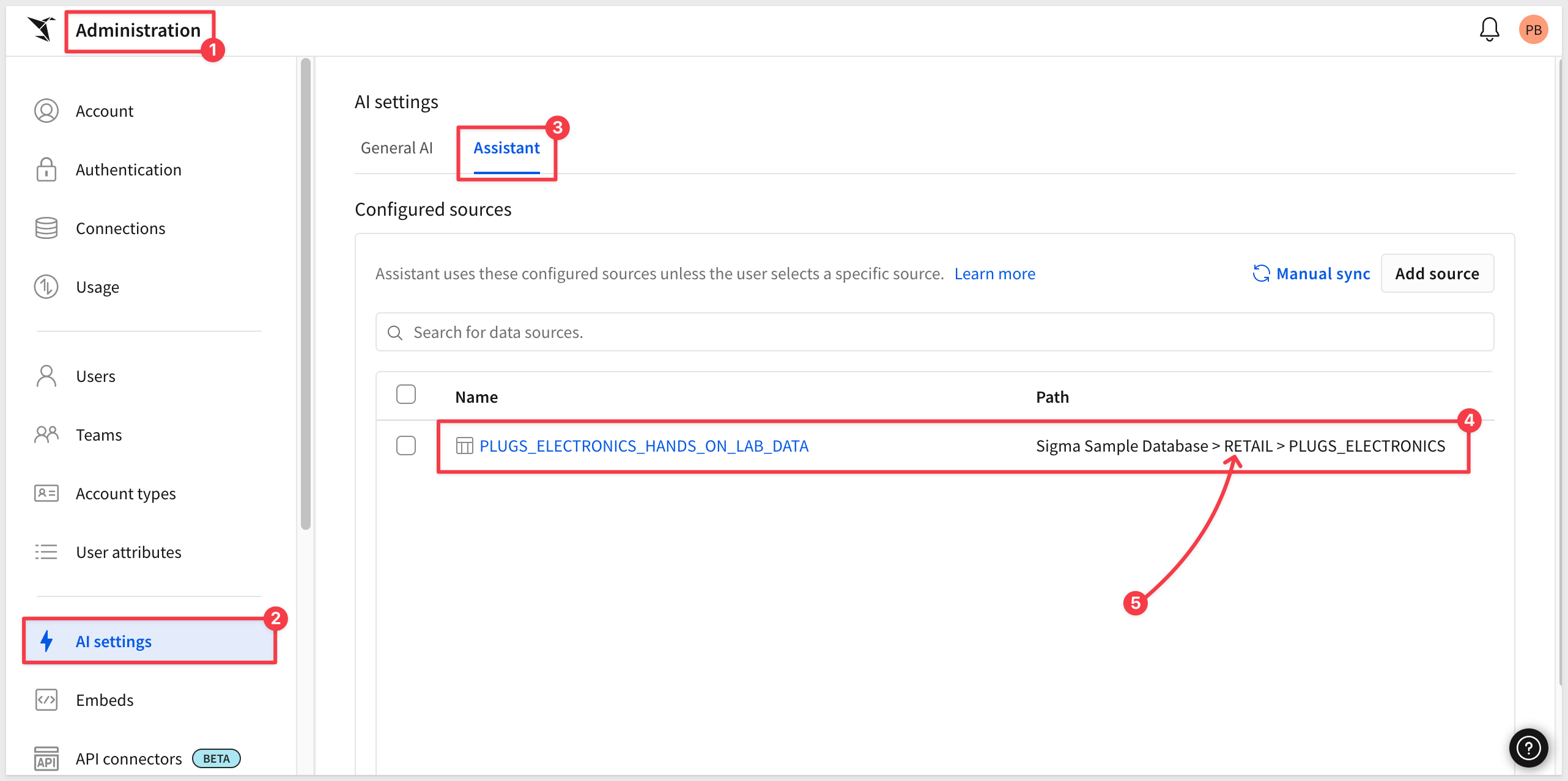 In Sigma, navigate to Administration > AI settings and select the Assistant tab. Click Add source, search for PLUGS, and select PLUGS_ELECTRONICS_HANDS_ON_LAB_DATA from the RETAIL schema: