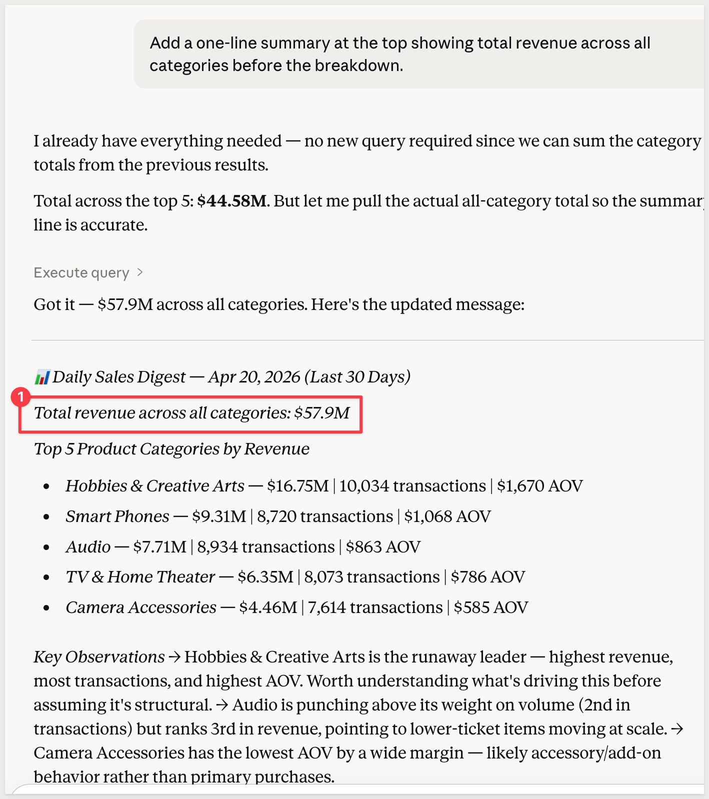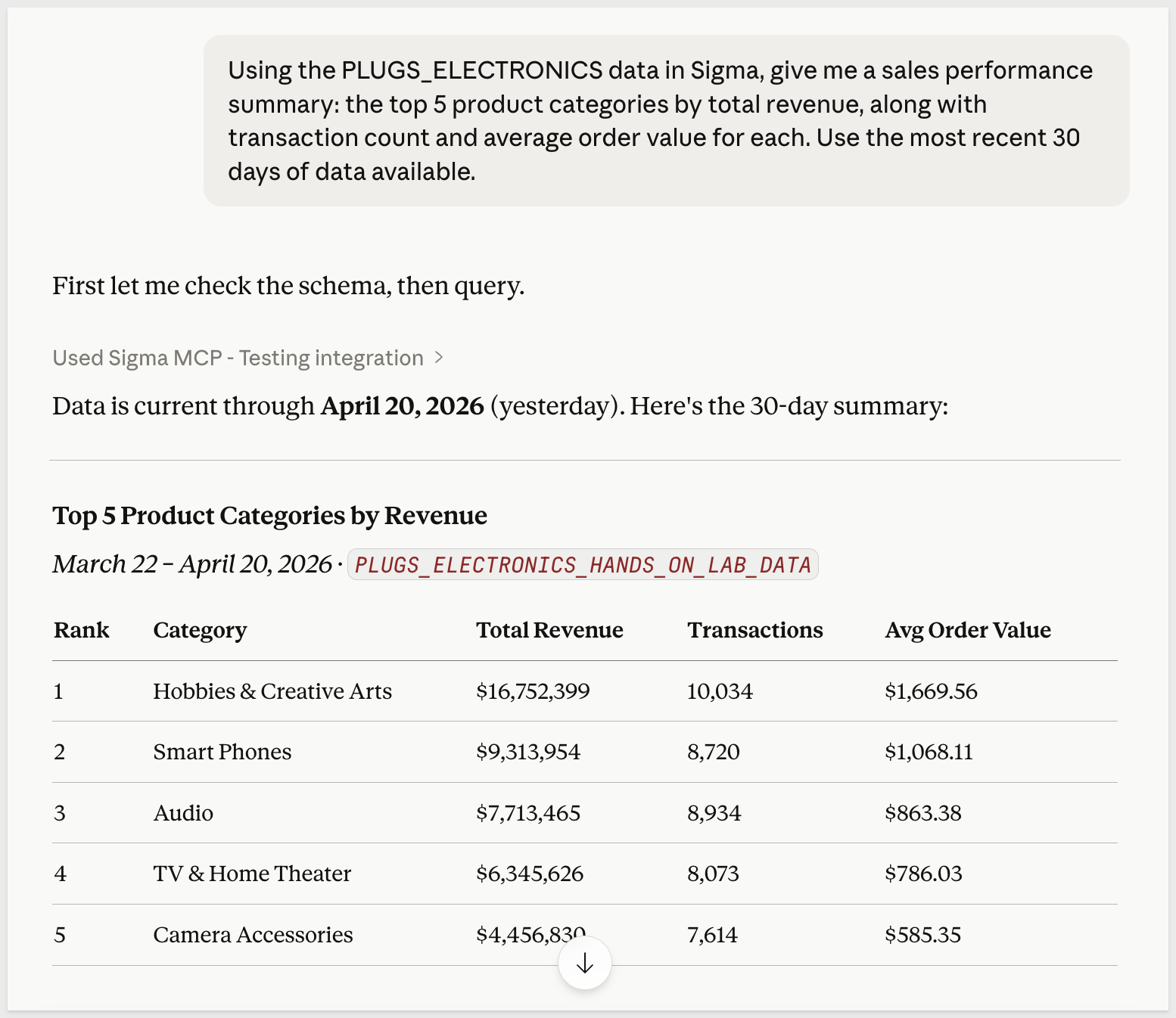 Sigma brings the data governance, live querying, and organizational structure. Claude brings the reasoning, formatting, and ability to act. Together they make it possible to go from a question — "what were my top categories this month?" — to a formatted, delivered answer on a recurring schedule, without building a pipeline or maintaining a dashboard.