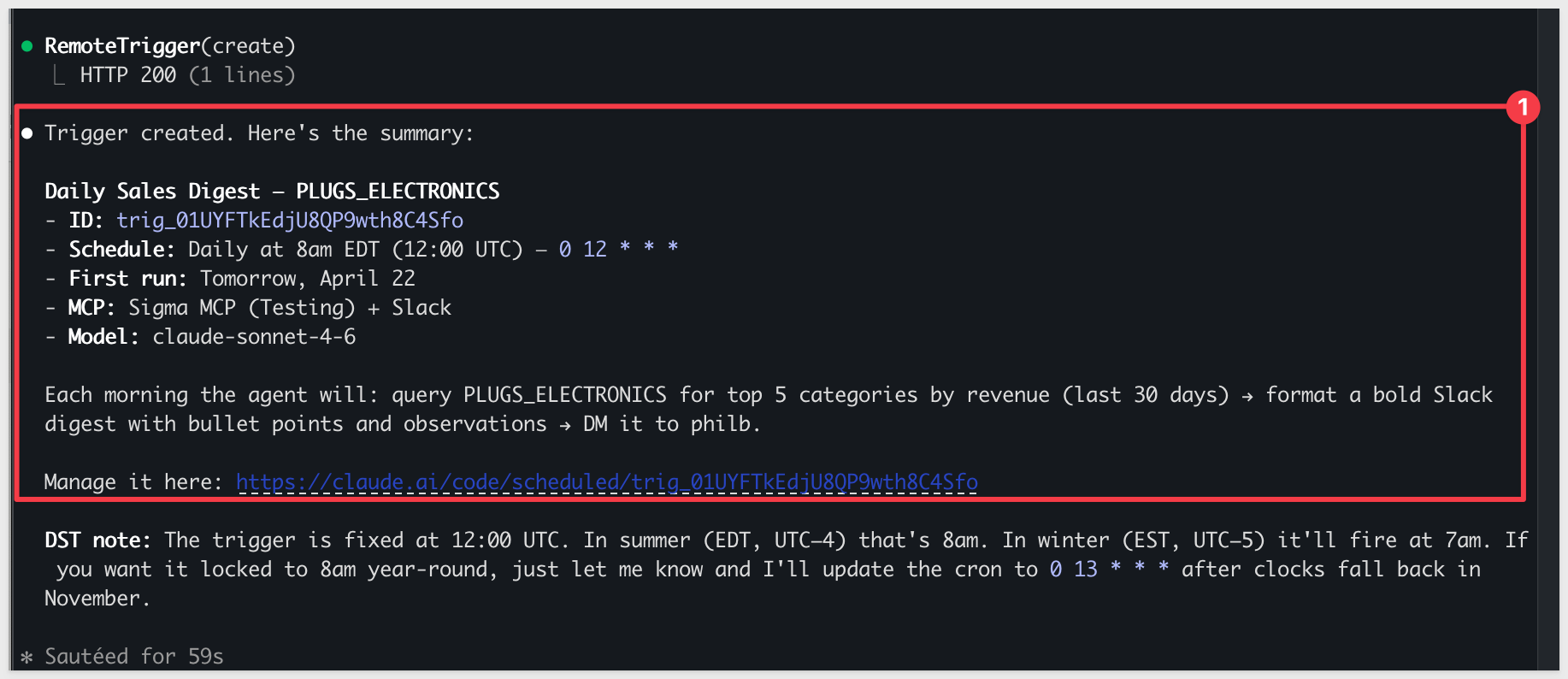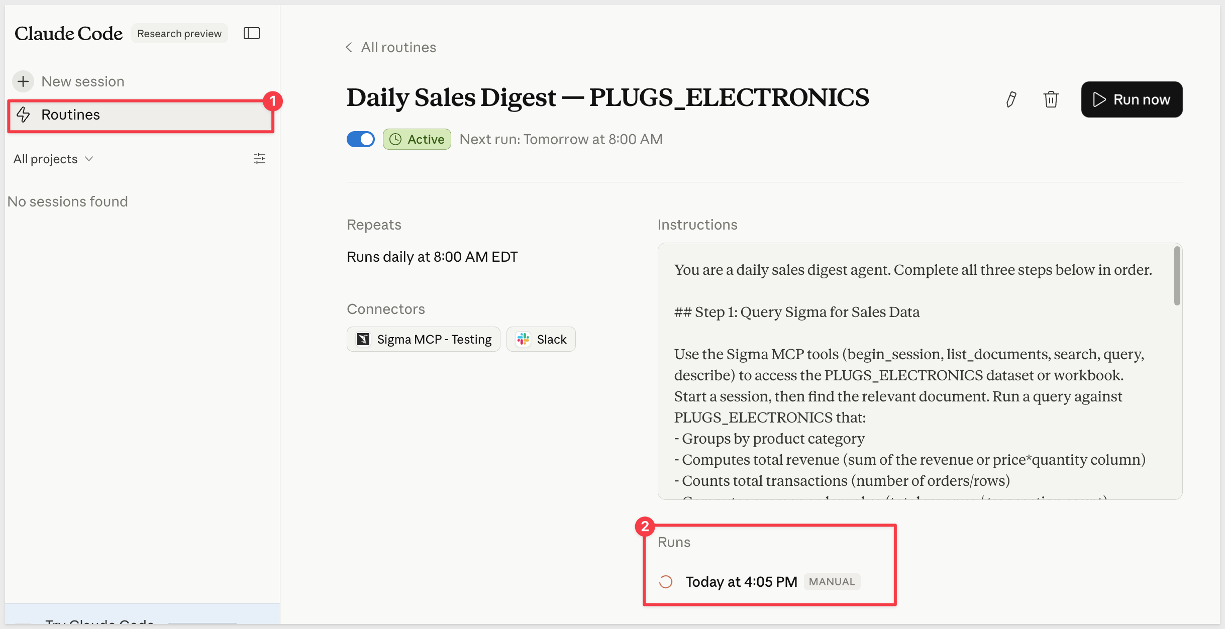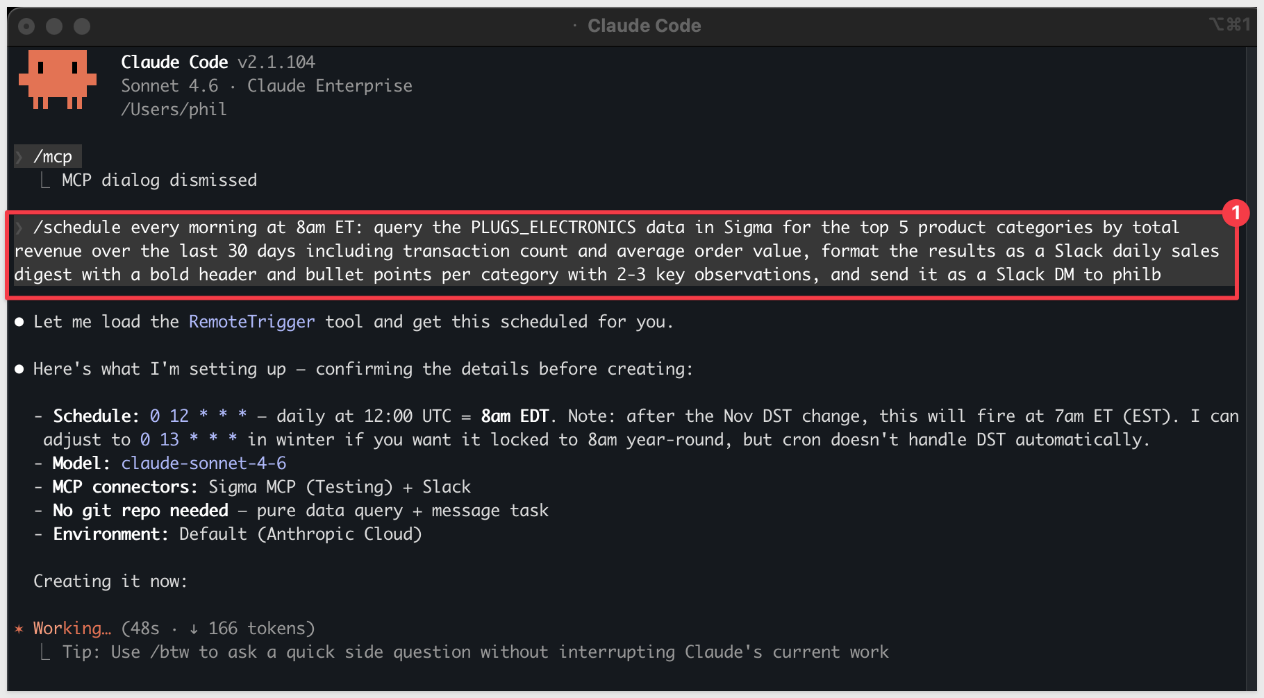 Use Claude Code to query live data from Sigma, format the results as a daily sales digest, and deliver it to Slack automatically — once now to verify it works, then on a recurring schedule.