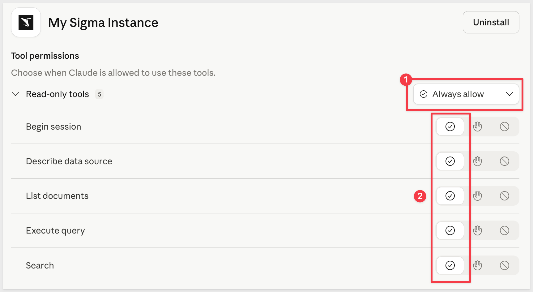 Click Configure. By default, nothing is authorized. For testing, select Always allow at the top level to enable Claude to use all Sigma MCP tools without prompting each time: