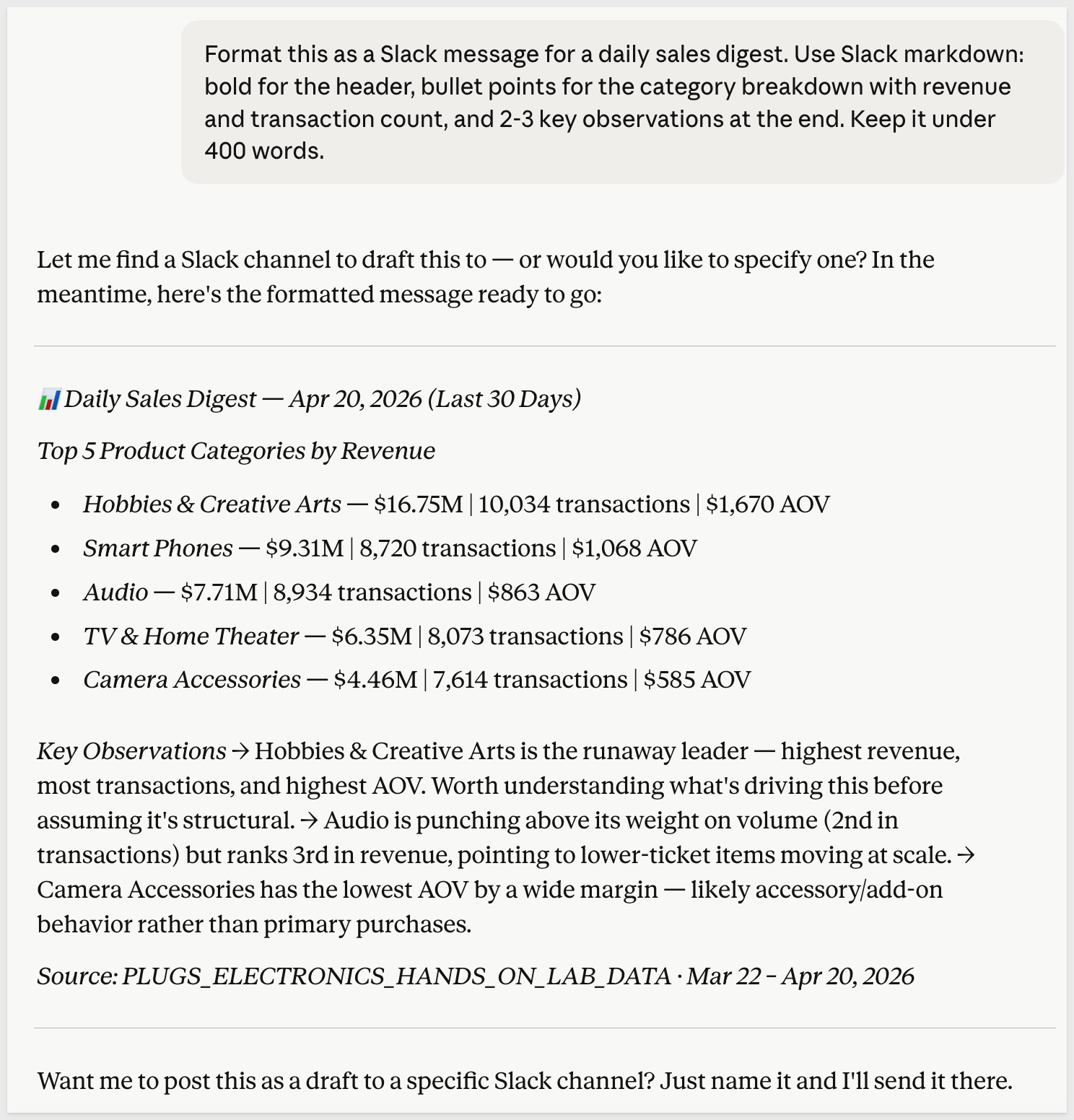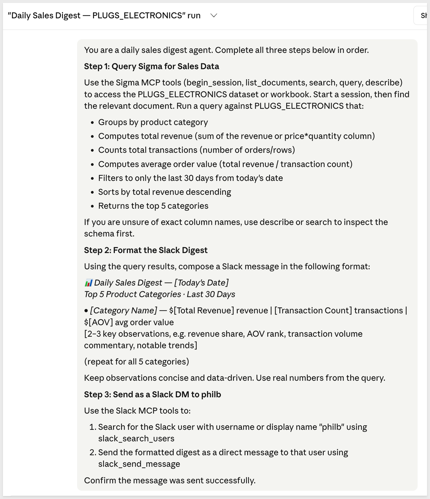 /schedule every morning at 8am ET: query the PLUGS_ELECTRONICS data in Sigma for the top 5 product categories by total revenue over the last 30 days including transaction count and average order value, format the results as a Slack daily sales digest with a bold header and bullet points per category with 2-3 key observations, and send it as a Slack DM to [YOUR_SLACK_USERNAME_OR_CHANNEL].