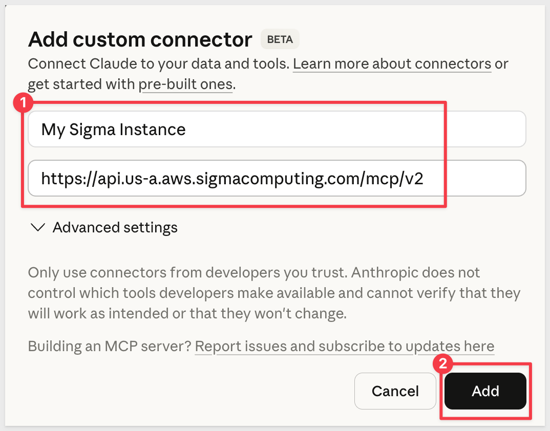 Give it a name and paste the MCP URL copied from Sigma, then click Add: